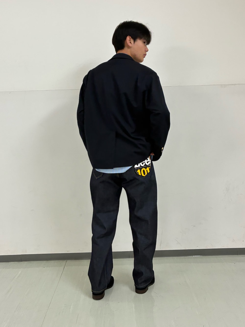 あえて裾をアウトして、カッチリしすぎない「抜け感」を出しました。ボトムスにワイドなデニムを合わせれば、都会的なスタイルの完成です。