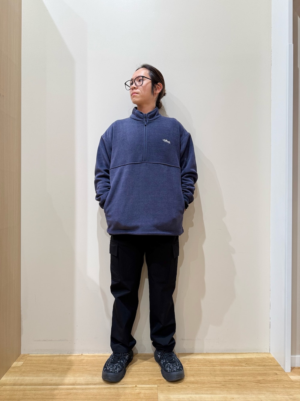 モックネックニットで首元に抜け感を出しつつ、カーゴパンツでラフさをプラス。