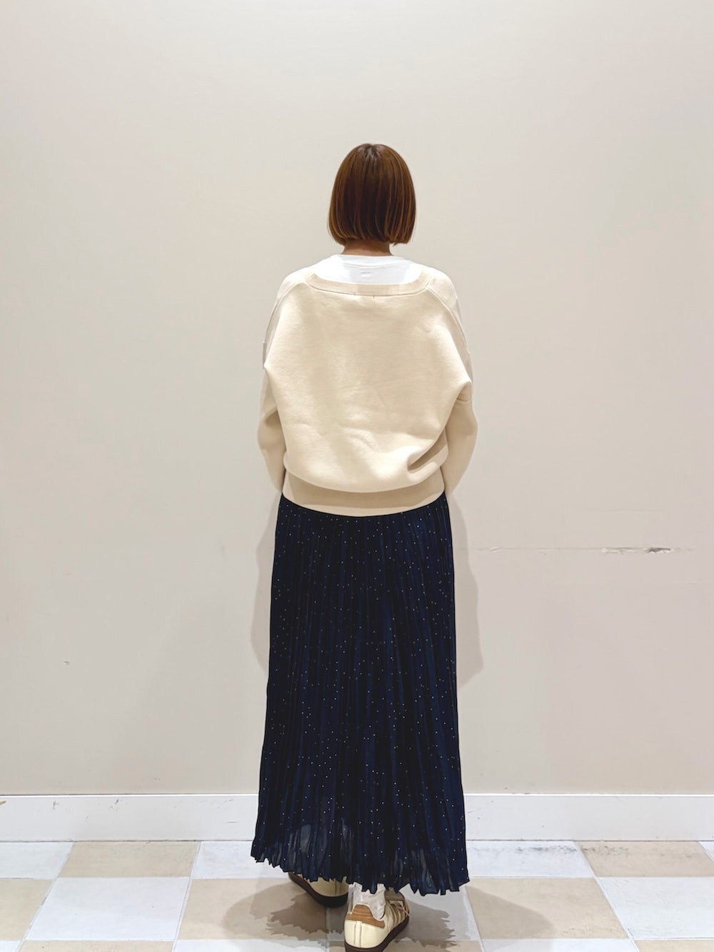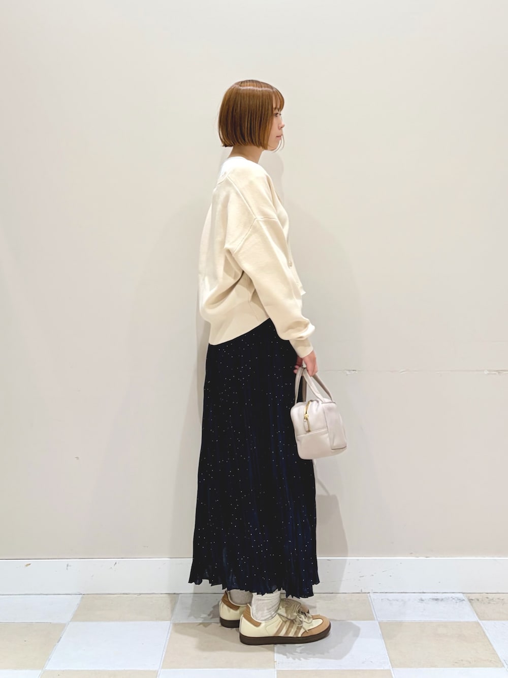 ゴールドのボタンがシンプルながら、アクセントのニットカーディガンにドットラメのギャザーロングスカートとスニーカーでカジュアルなコーディネートに!