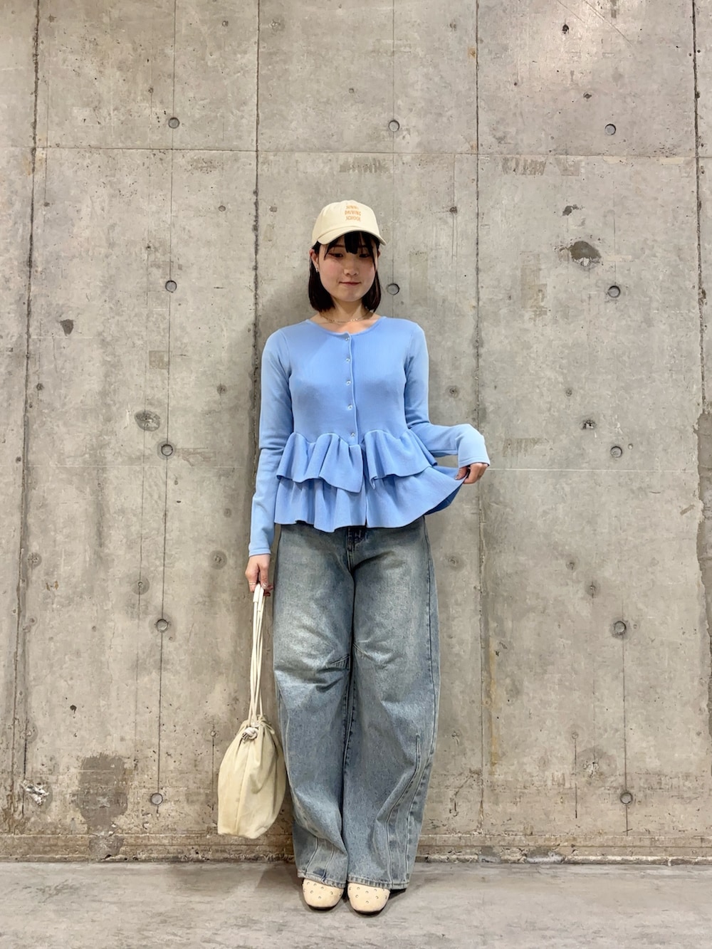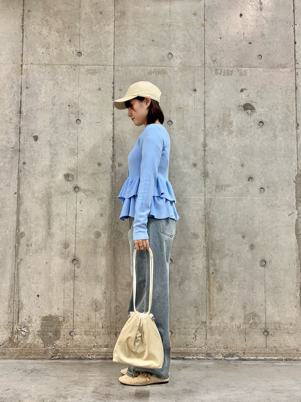 水色のトップスは裾部分が可愛く、これ一枚で春おしゃれ完璧です✨