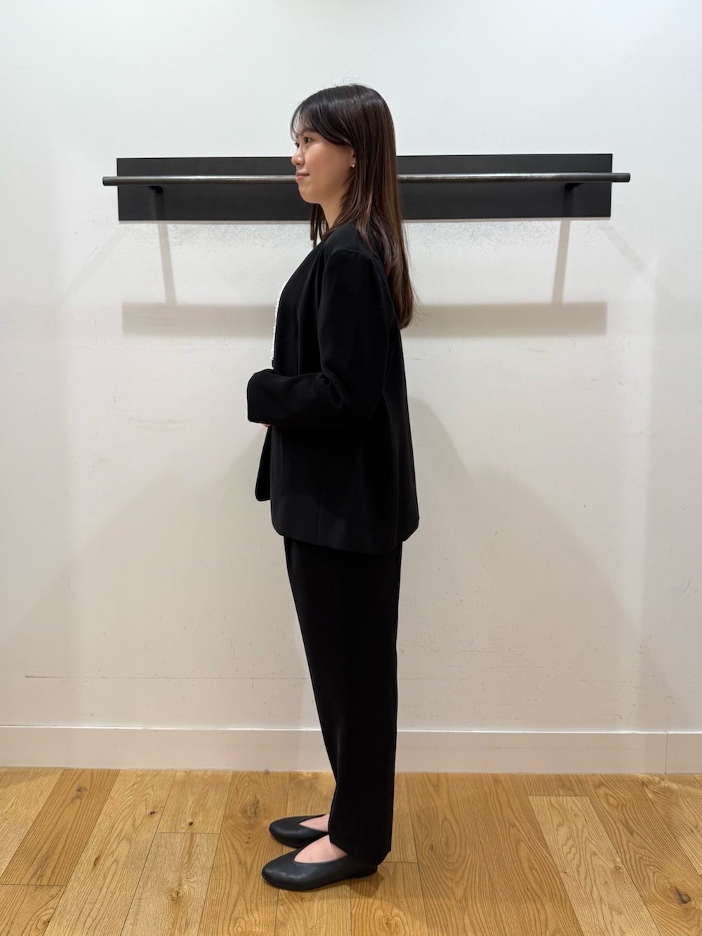 ベーシックなブラックのジャケットとテーパードパンツでまとめた、セレモニースタイルです🌼