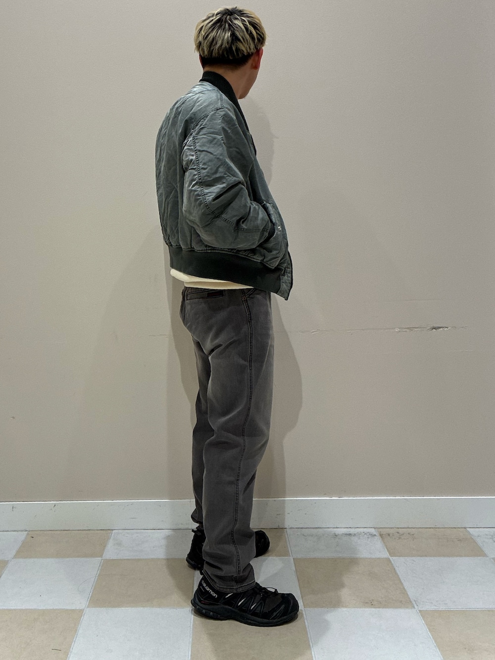 デニムはややフェード感のあるグレーを合わせることで、無骨さと今っぽさを両立。
