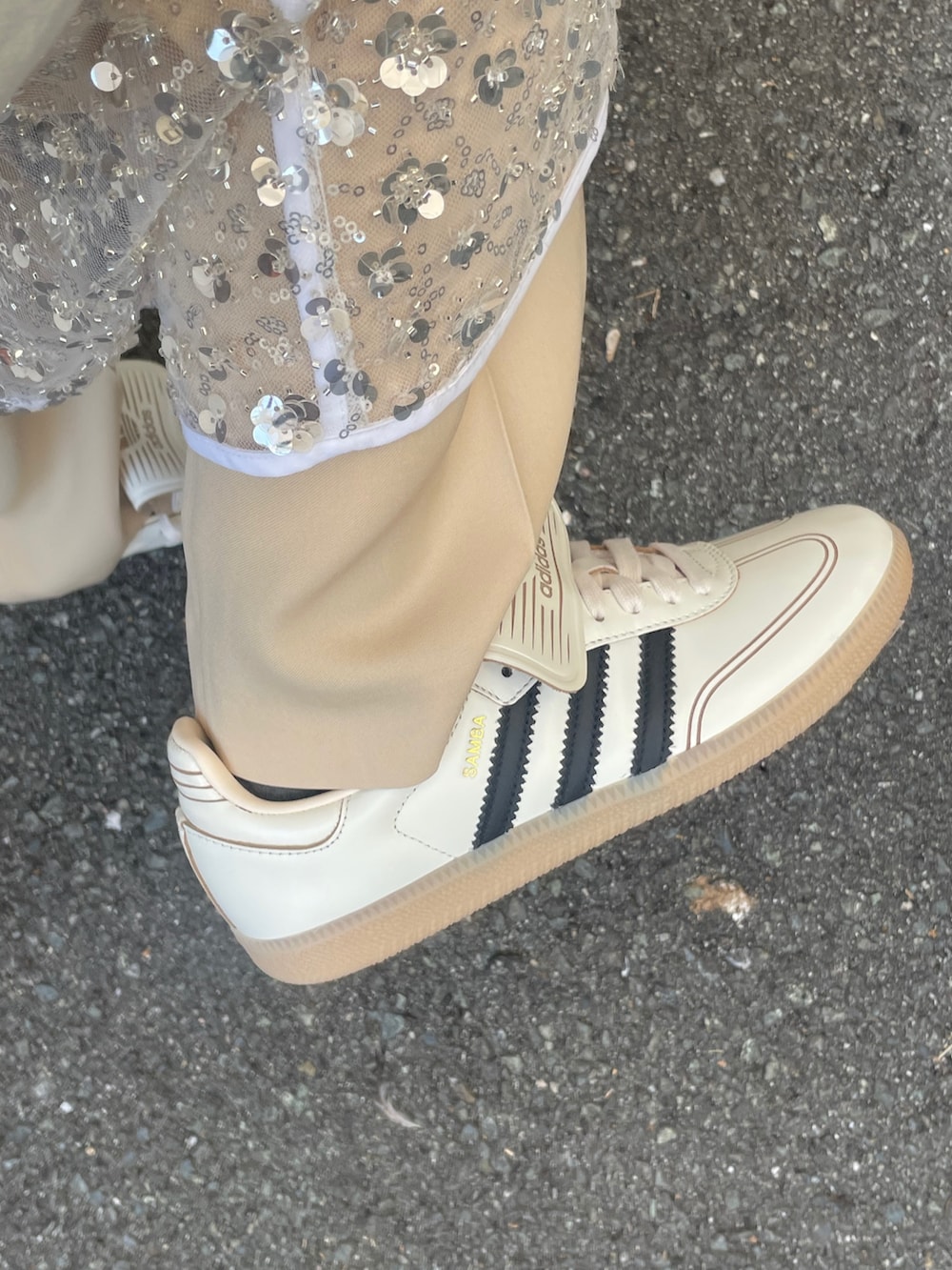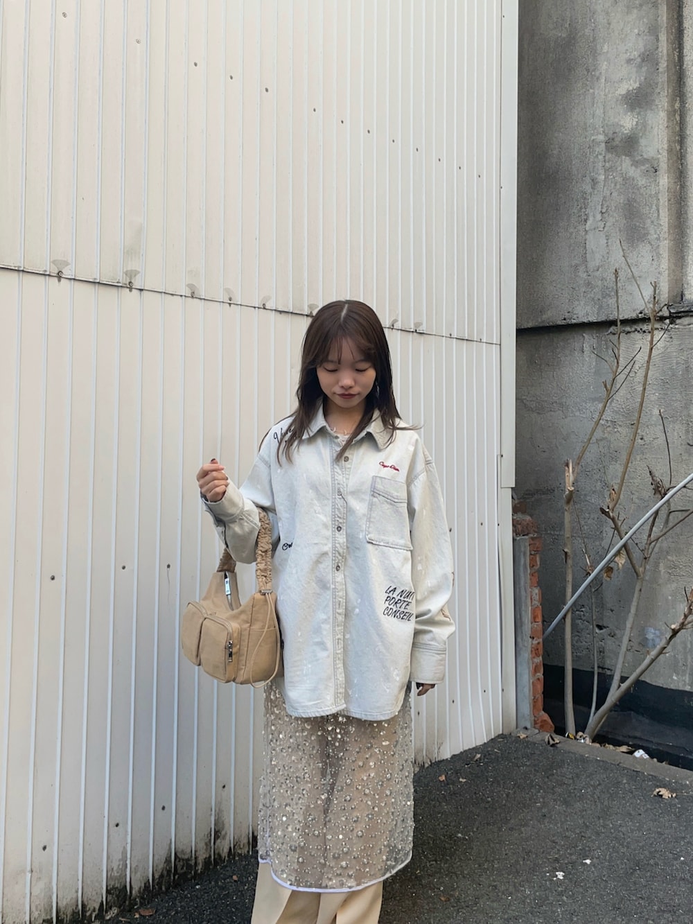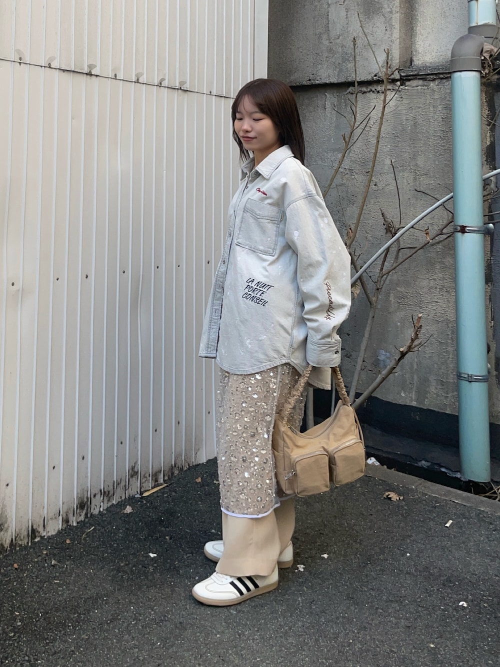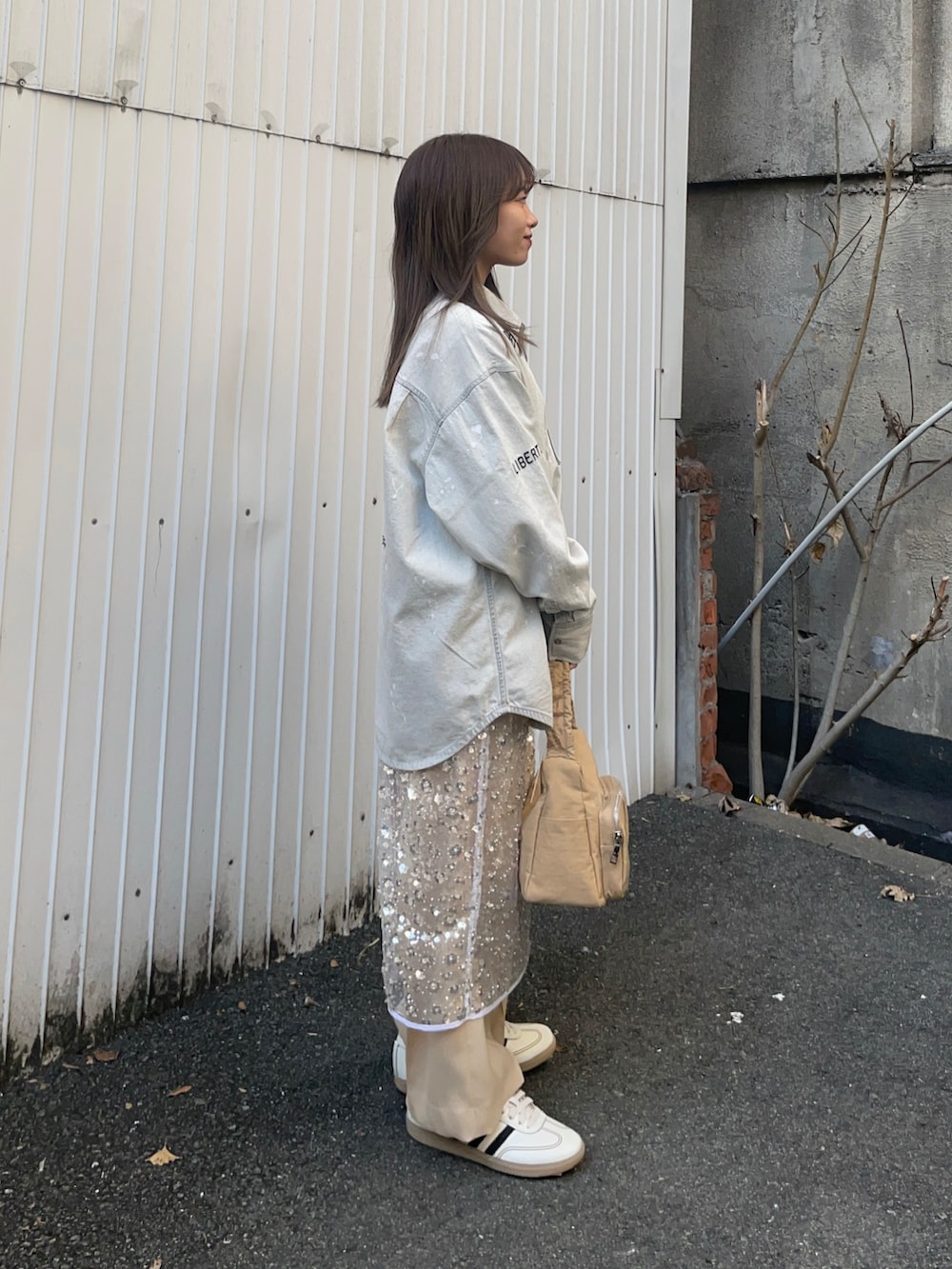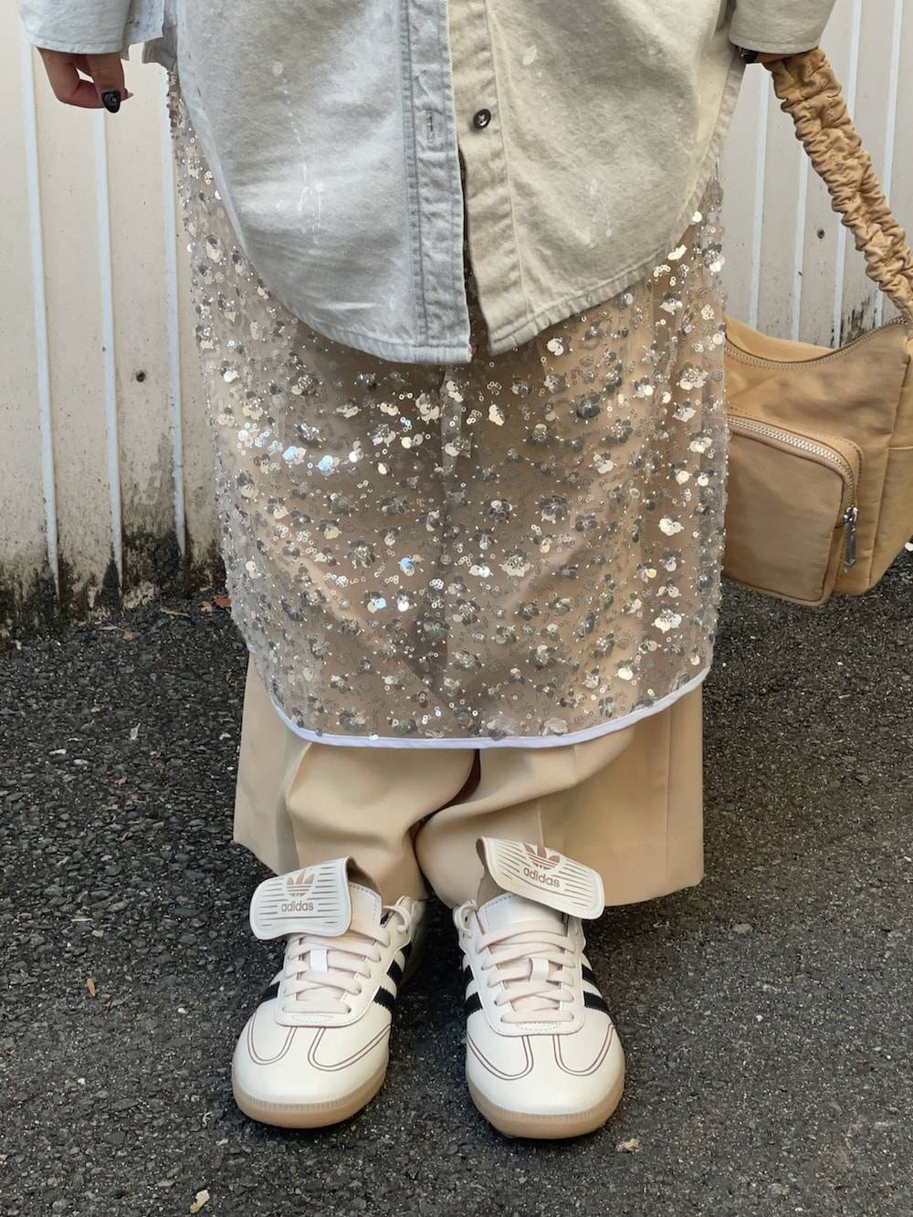 ボトムスはキラキラのスパンコールスカートをレイヤードしたパンツコーデで、スカートを入れることで一気におしゃれ上級者になれます✨私の身長でも折らずに履けました!