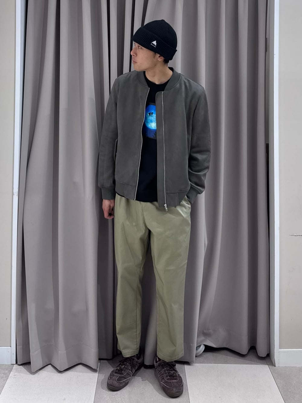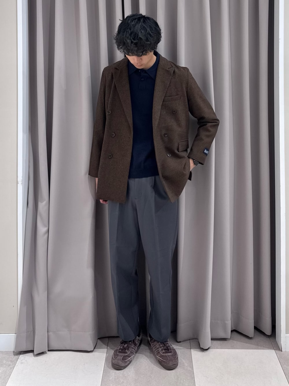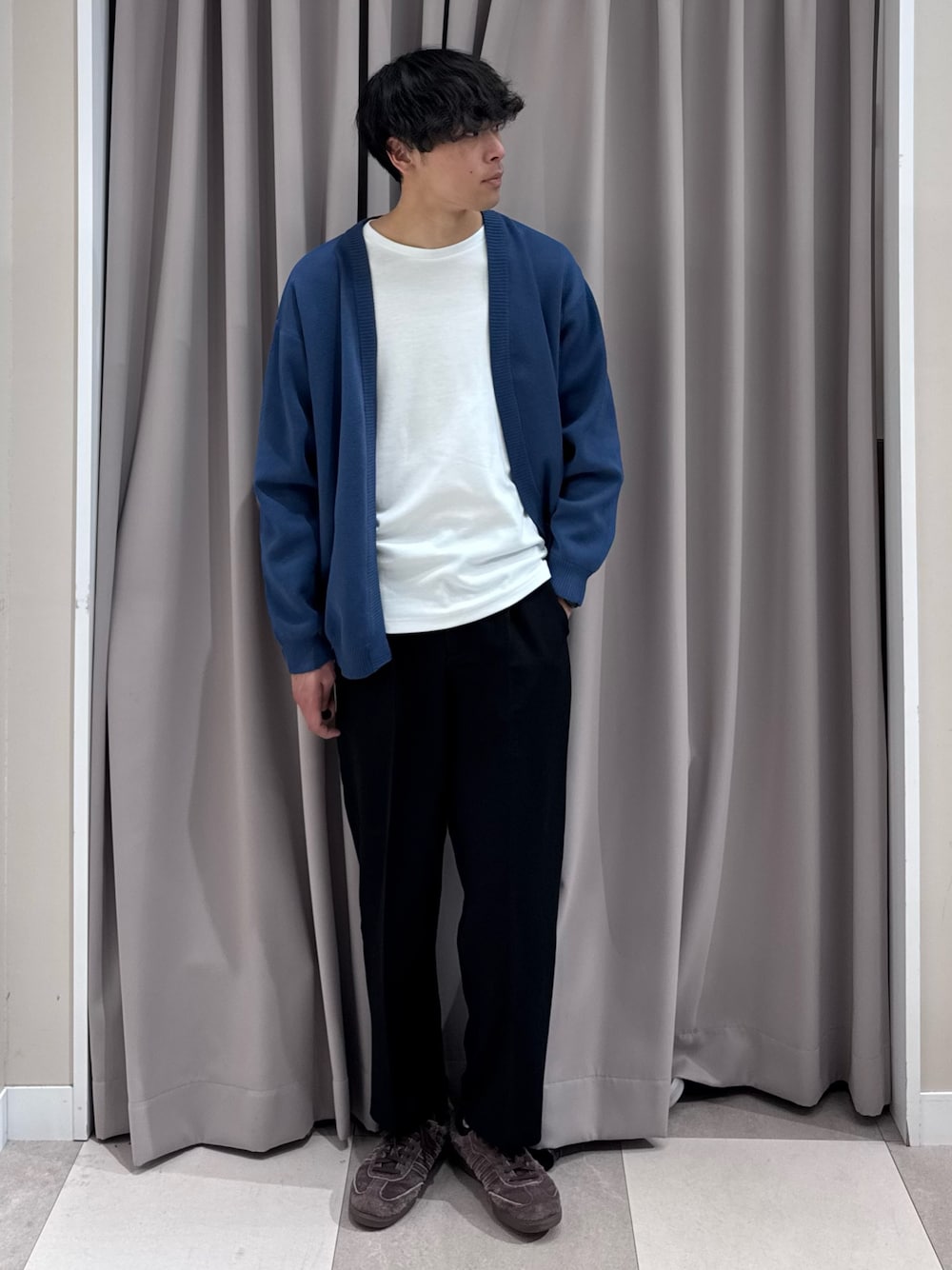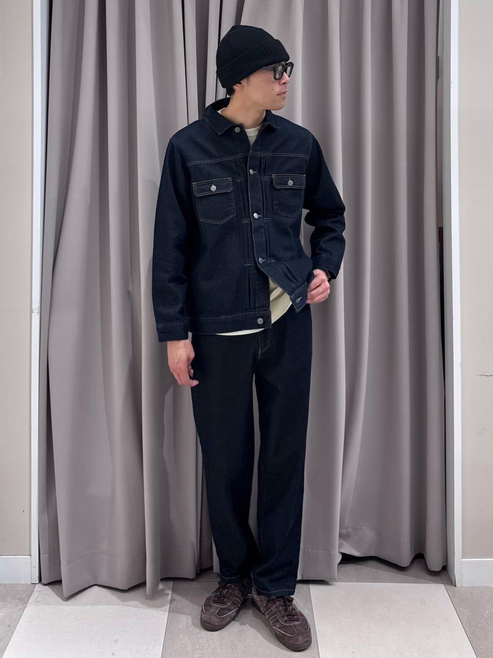 股上若干深めのデニムパンツとの相性もよく、決まり過ぎないデニムセットアップ。