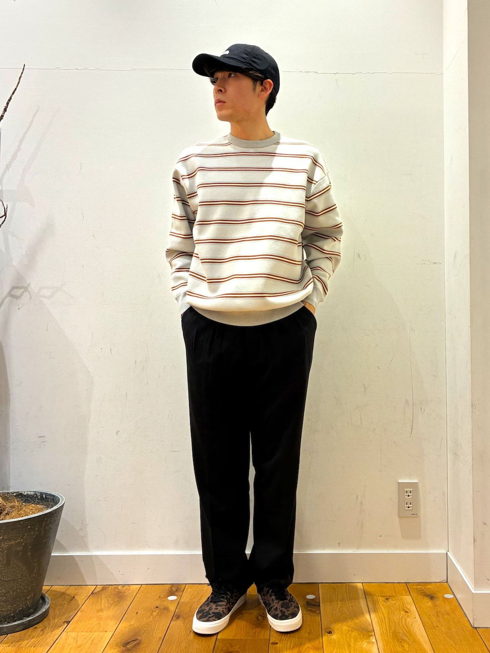 中にスタッフやお客様の声を頂き作り上げた完声のボーダーニットを着ています!!ゆったりしており、色合いも明るいので色々なコーデに着まわす事が出来ます!!又、パンツも同じで色々な人の声を頂き作り上げた物で2タッグになっており、ゆったりとしています!生地はサラサラしておりとても履き心地が良いです!!