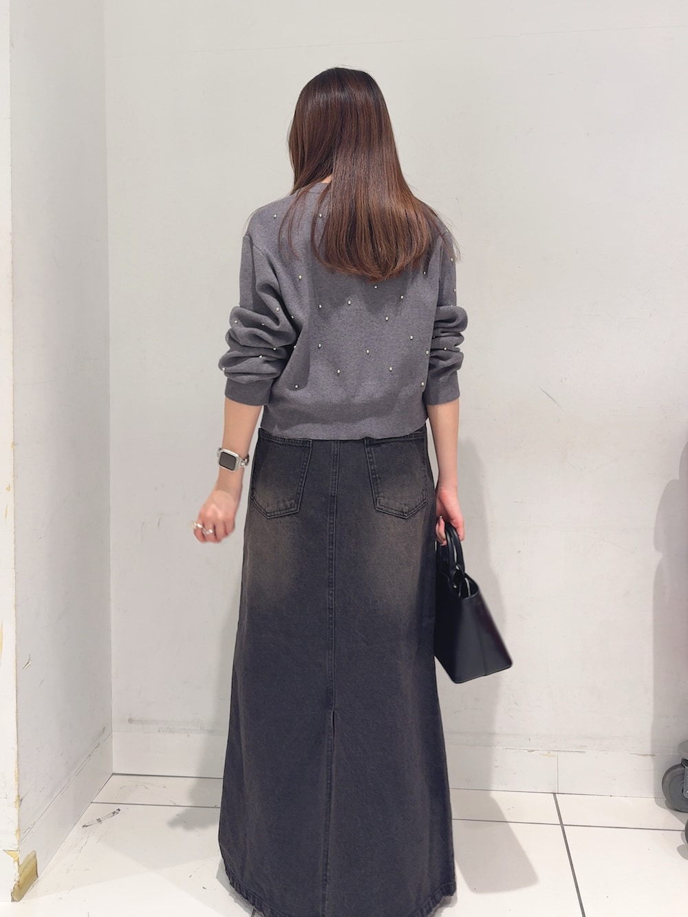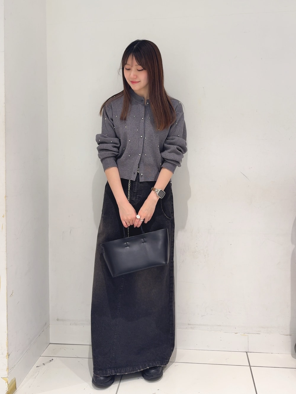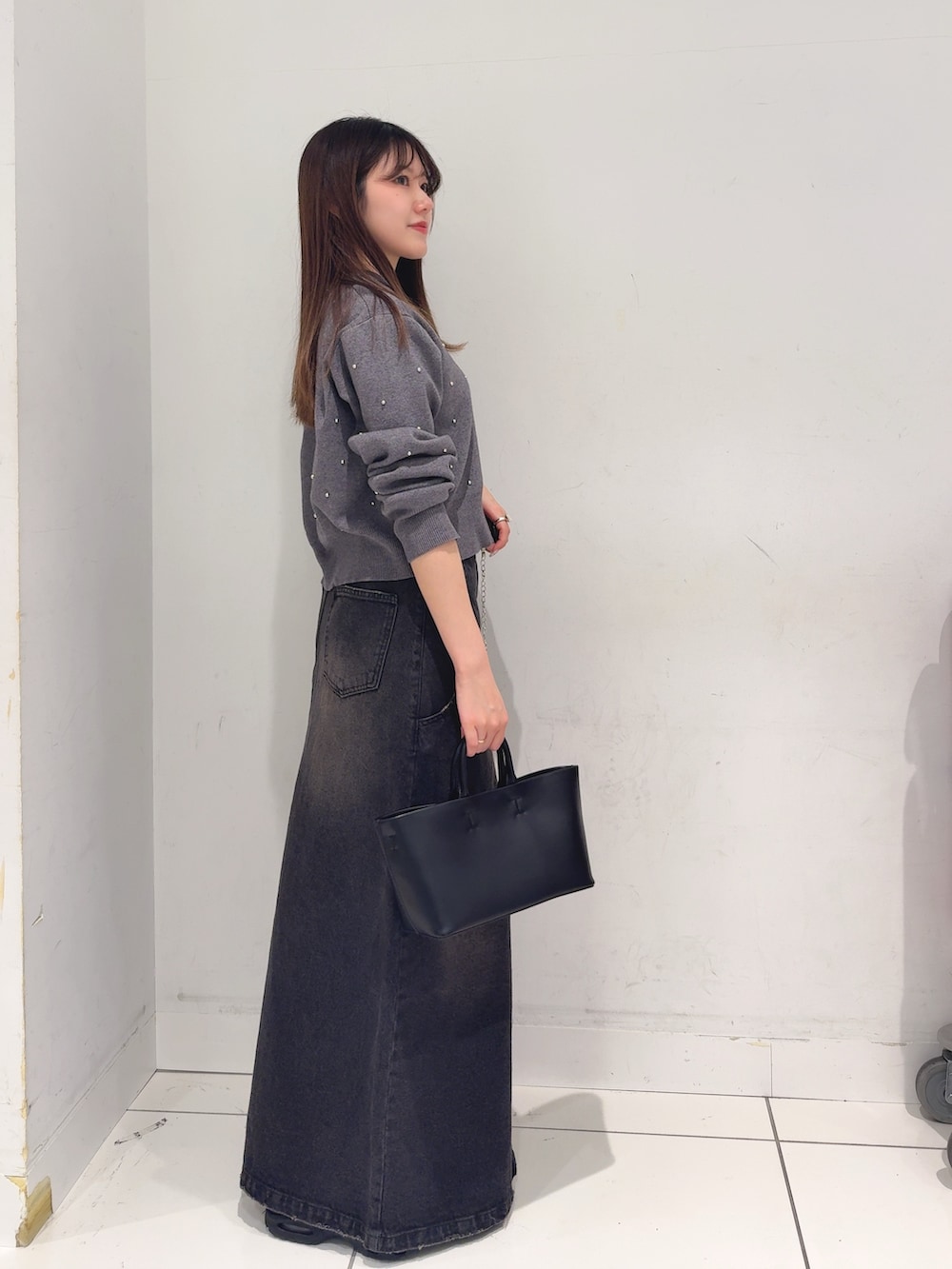 アクセントにメタリックなベルトを合わせました🪩