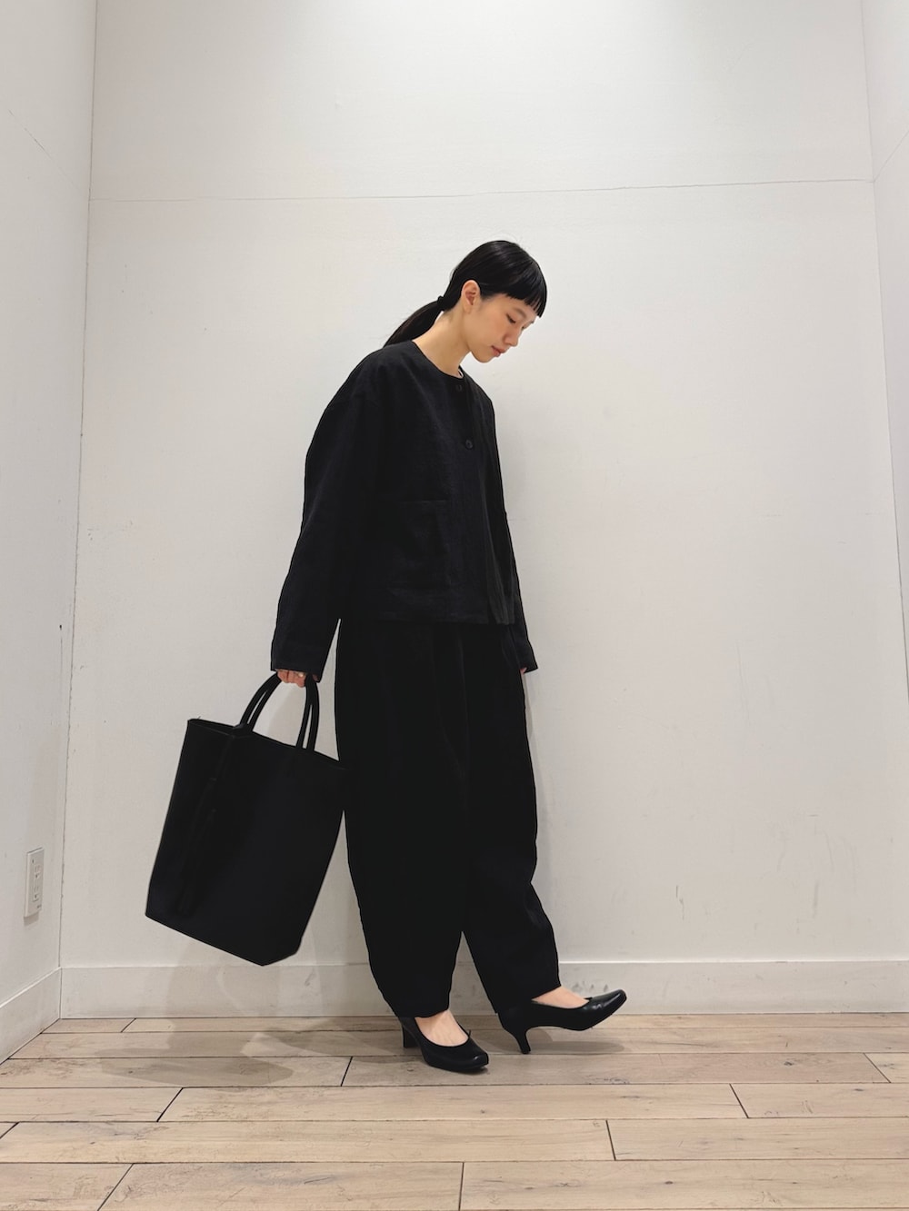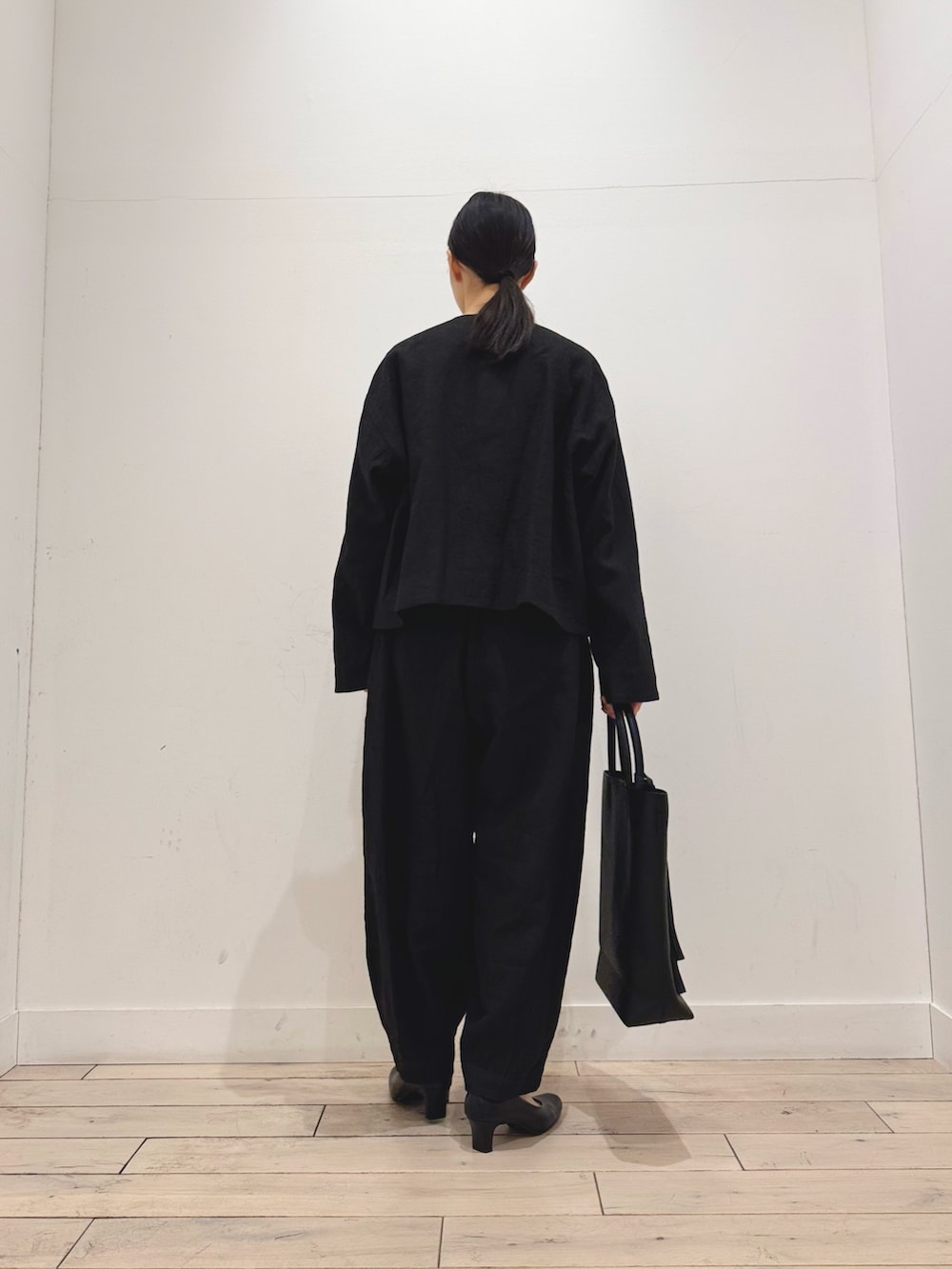 少しボリュームのあるパンツですが、ジャケットの絶妙な丈感とサイズ感で素敵にまとまります◎