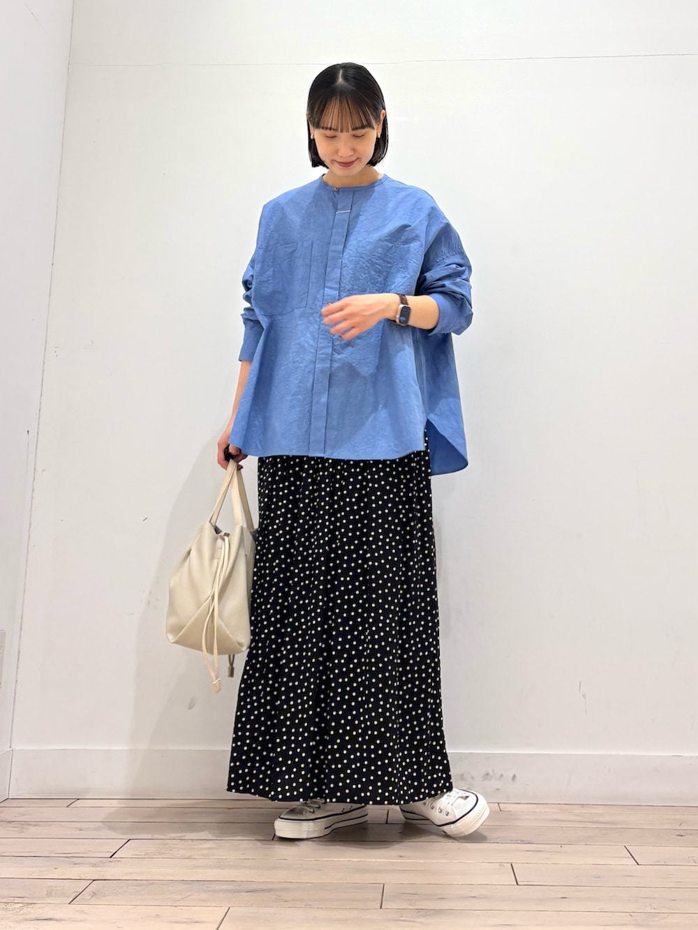 程よくハリがあるコットンリネンを使用しており、ほのかなシワ感が雰囲気のある一枚です👏
