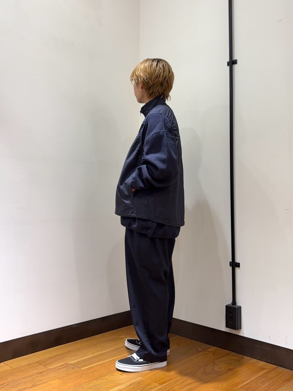今回は新作のパンツと新作のベストを使ったコーデです。パンツは昨シーズン、瞬く間に姿を消したWideDadの人気アイテムをベースに、さらなる高みを目指した一本です。今回はWideDad別注の「D.Navy」を使用し、深みのある色気と知的さをプラス。リラックスできる穿き心地はそのままに、素材と色味を徹底的に見直すことで、オンオフ問わず愛用できる万能なパンツへとアップデートを遂げました。