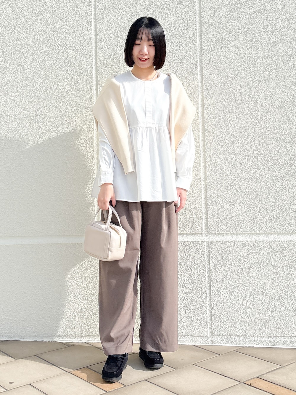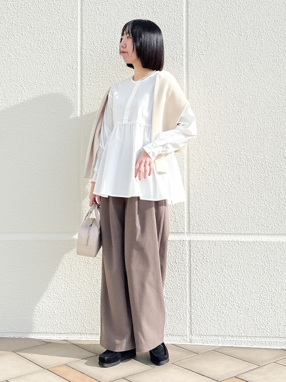 ブラウスはバスト下からギャザーが入っていてふんわりとしたシルエットが可愛いです!サイドにスリットが入っているので余分なボリュームは減らしてくれます^^