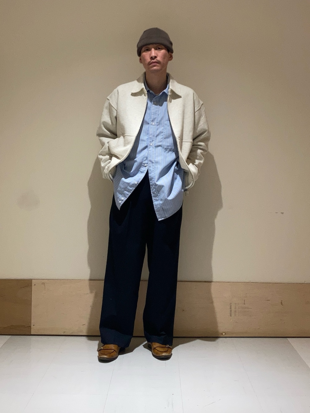 整え過ぎには注意で、フルジップの襟付きのスウェットでカジュアルダウン。