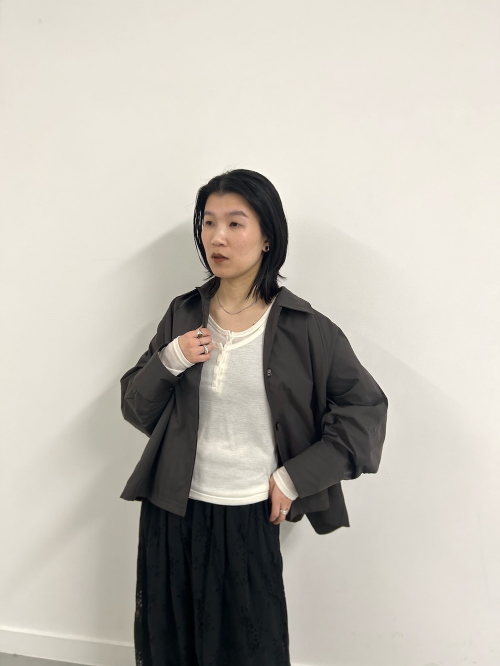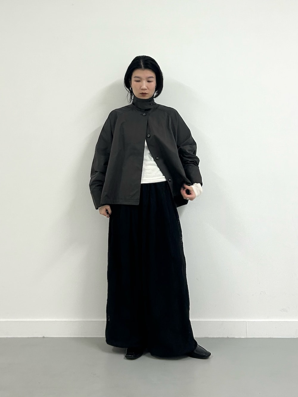 裾がふわっとマントのように広がっているステンカラーコート、広がってることで下半身を華奢に見せてくれます◎