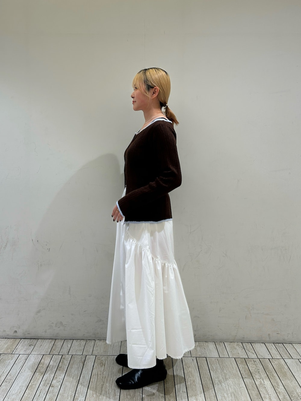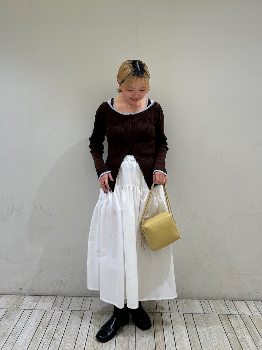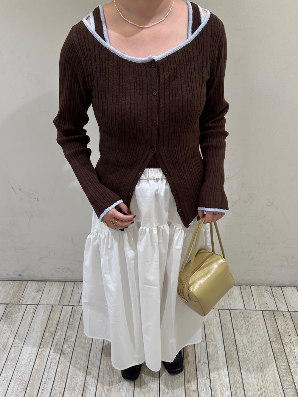 カーディガンは下のボタンを2〜3個開けるとスッキリ着こなせるのでおすすめです!