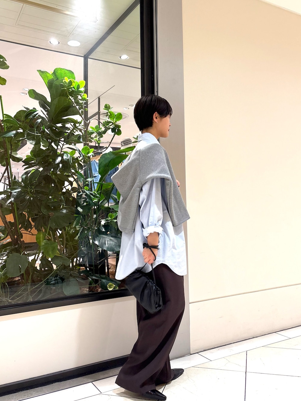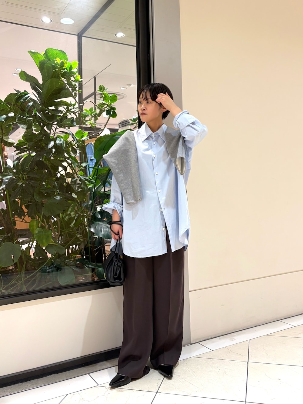 スウェットを肩に掛けてきれいめカジュアルに!