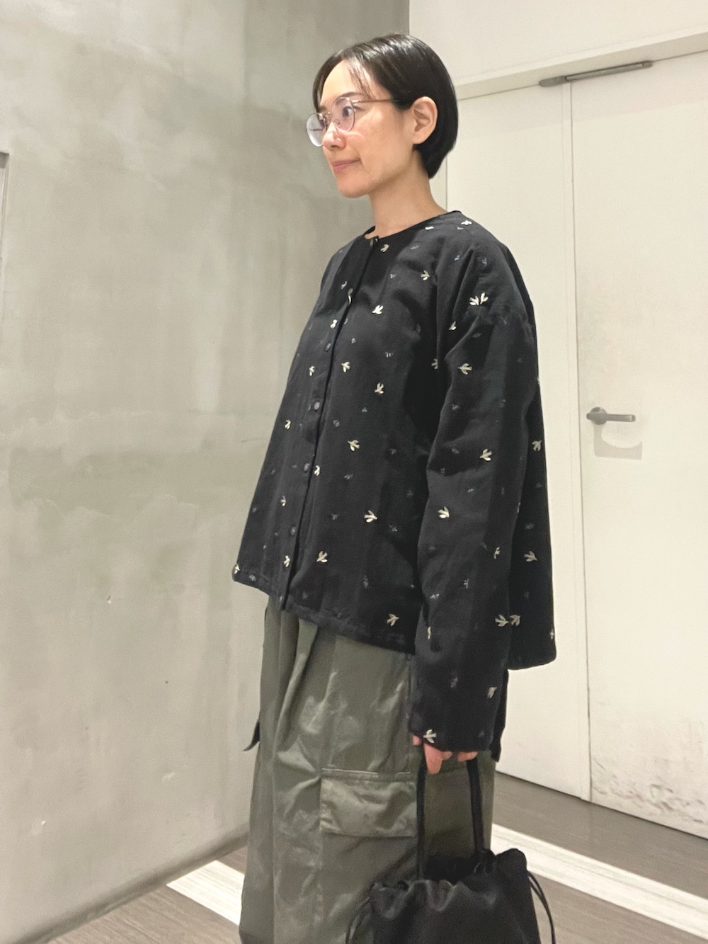 ツバメ刺繍が目を惹くブラウスにメンズライクなボトムスを合わせました。