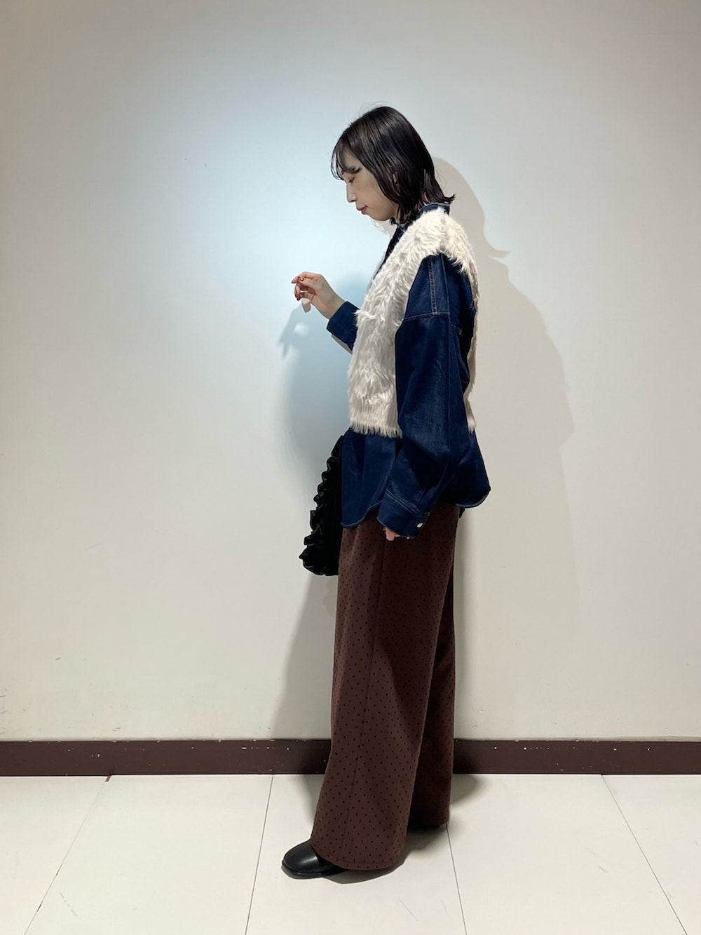 デニムシャツとシャギーショートベストの組み合わせ✨️