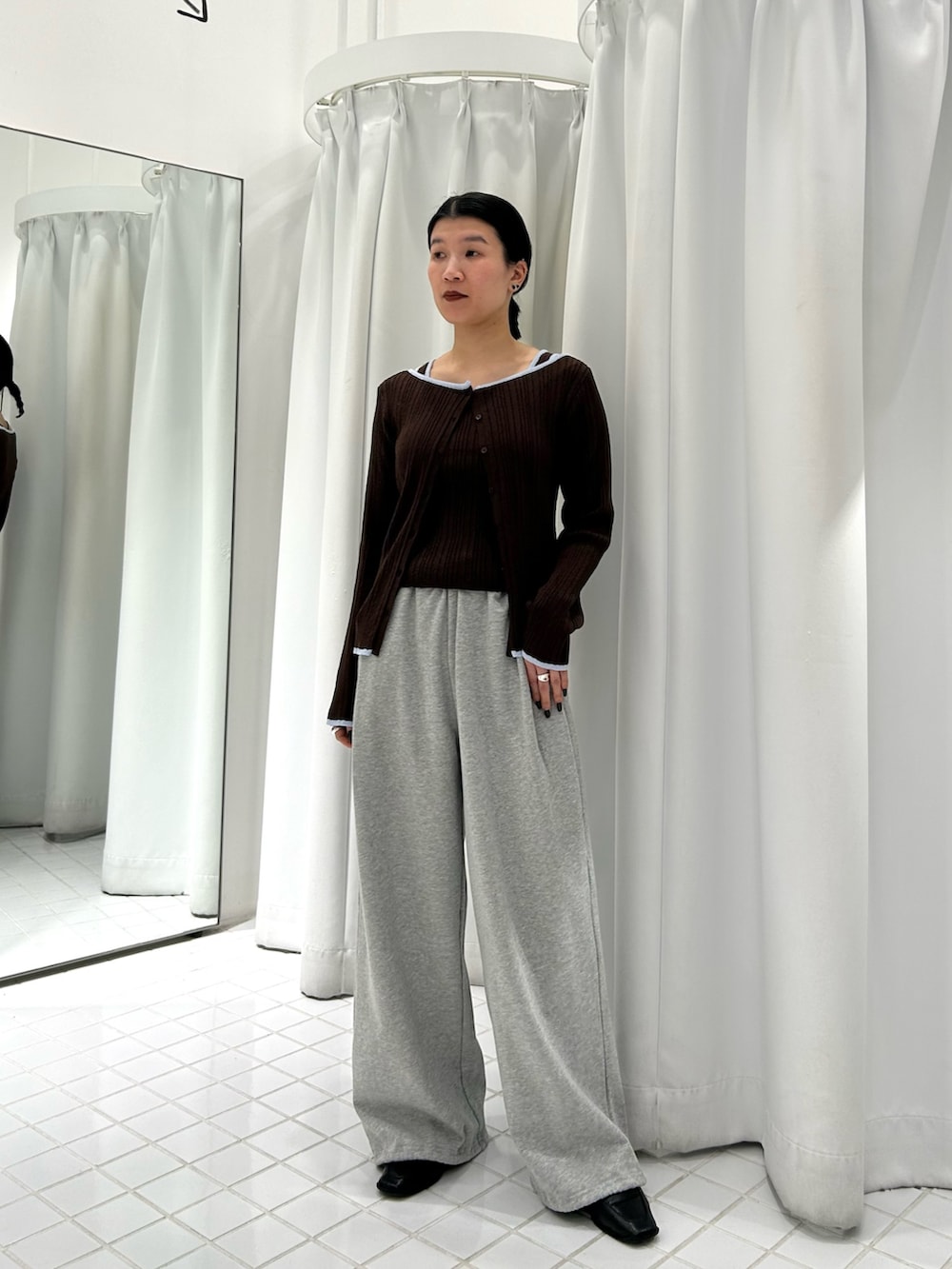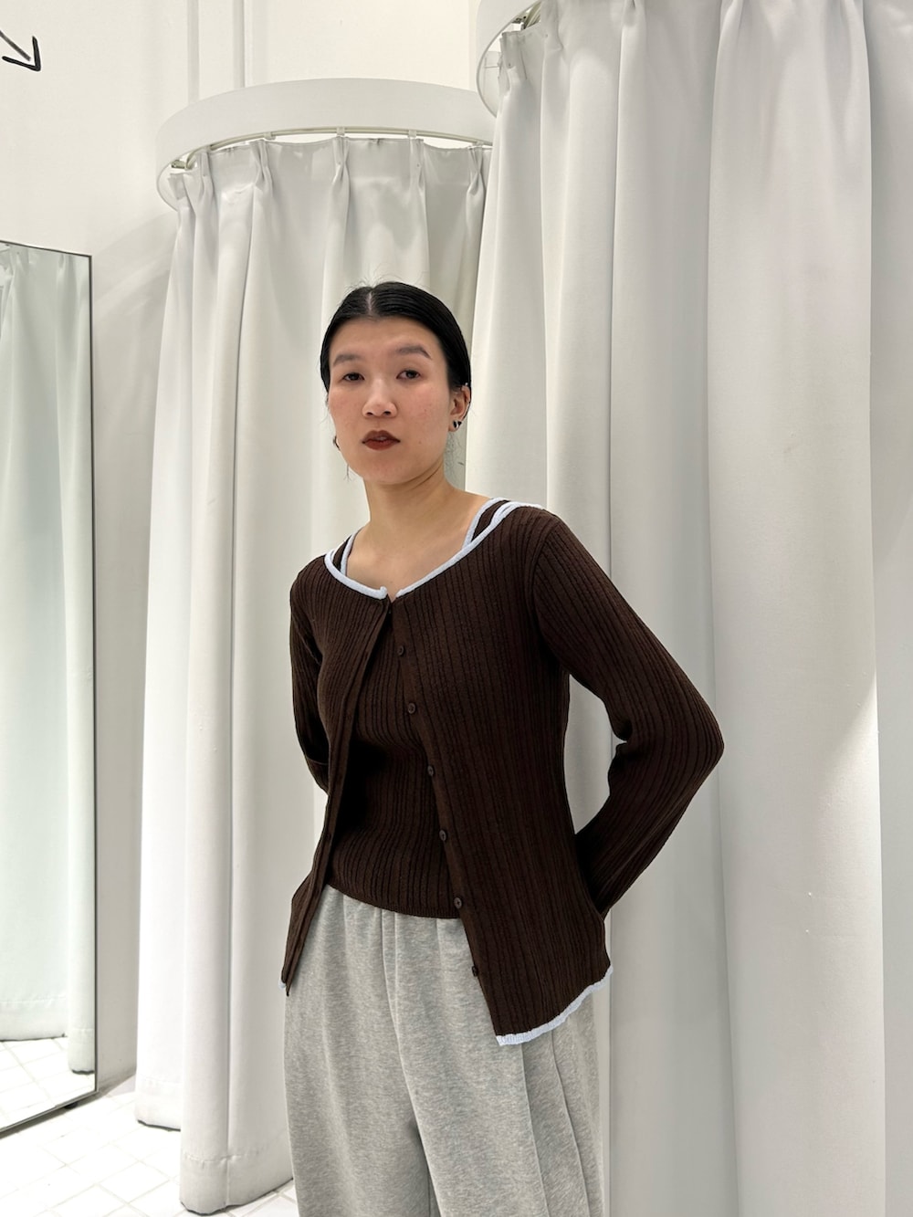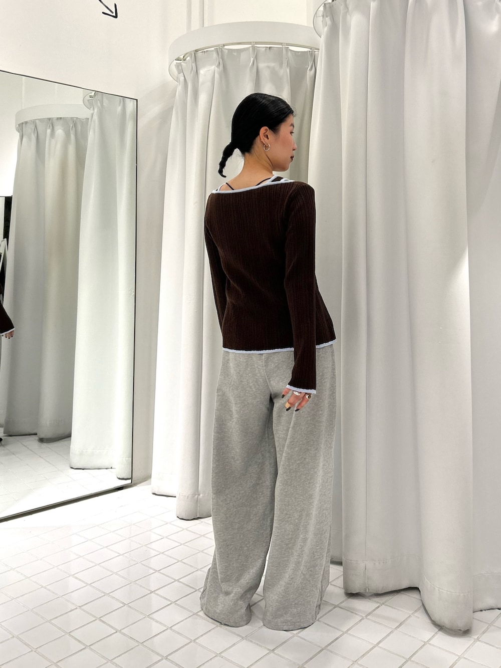 柔らかいリブニットでかなり伸縮性があり、バイカラーのパイピングがアクセントになります◎