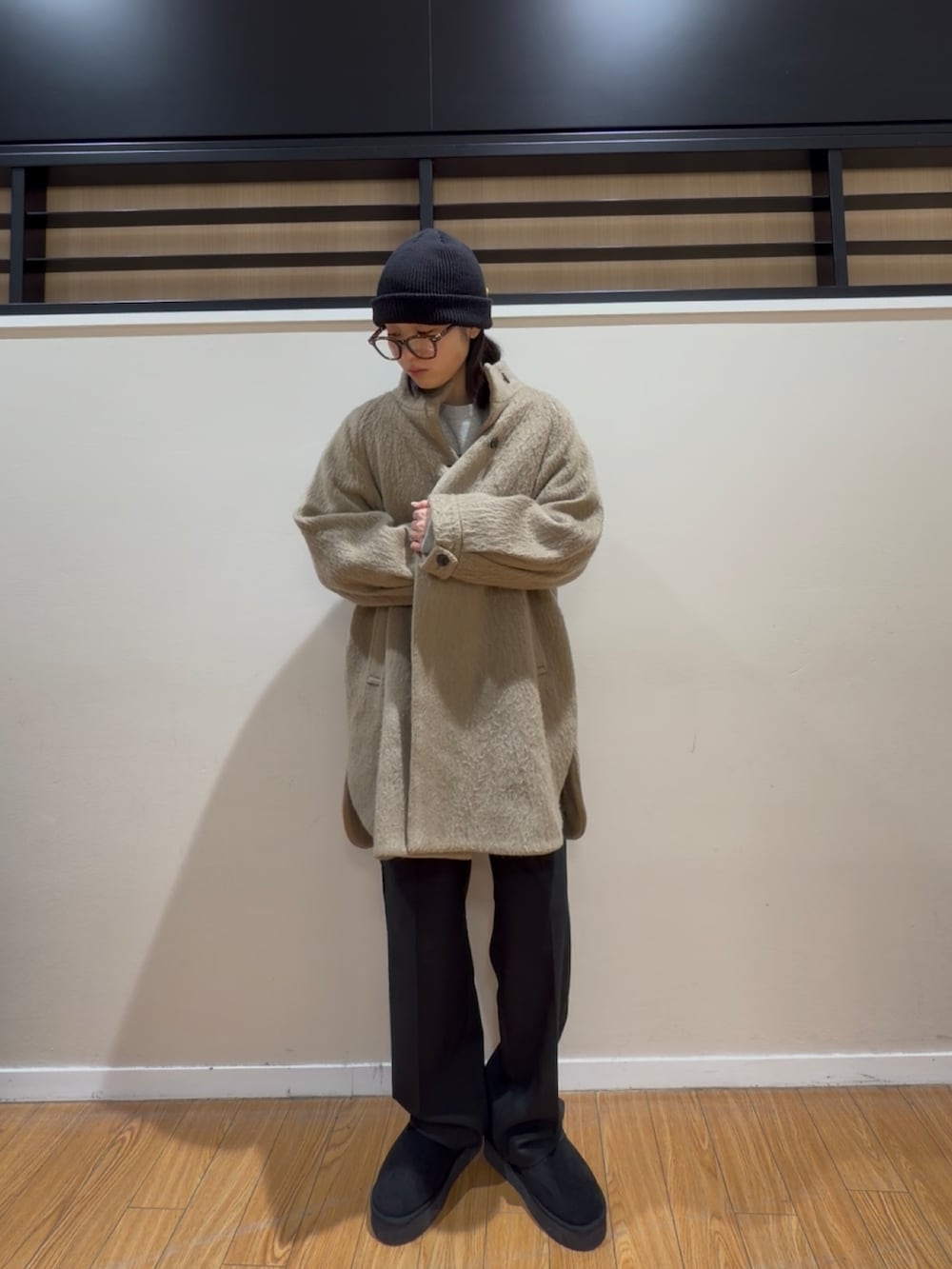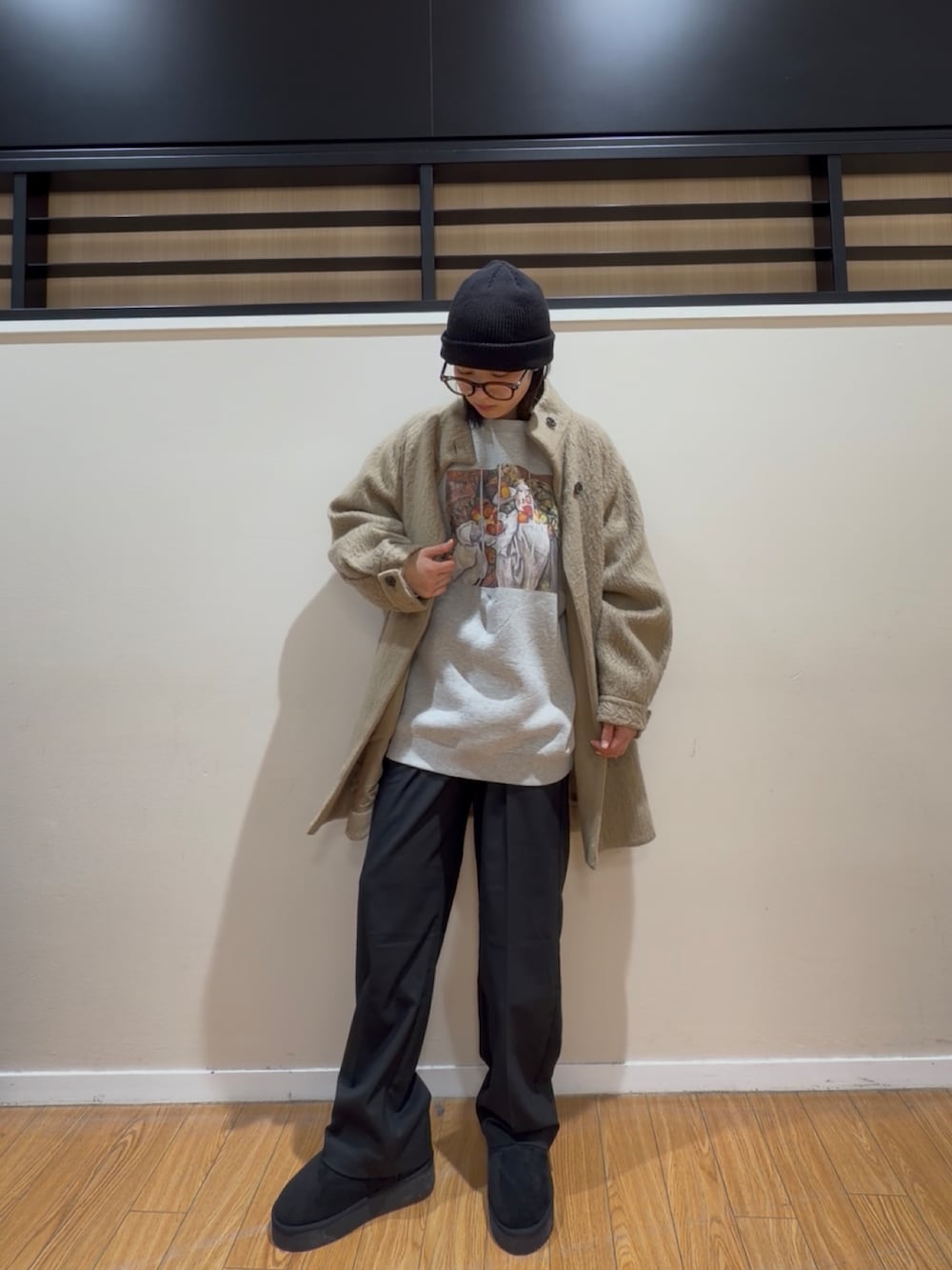 ベージュのコートを主役に、全体を落ち着いたトーンでまとめたコーディネートです。インナーのグレーパーカーで少しカジュアルさを出し、ワイドパンツでシルエットにゆとりを持たせました。ニット帽とメガネを合わせることで、ラフさと抜け感を意識しています。