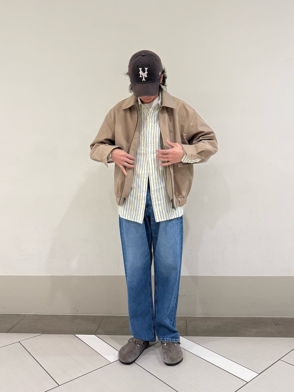 いつもご覧いただきありがとうございます。インナーの白Tシャツ、ストライプシャツ、そしてハリのあるスイングトップと、3層のレイヤードを見せてみました!