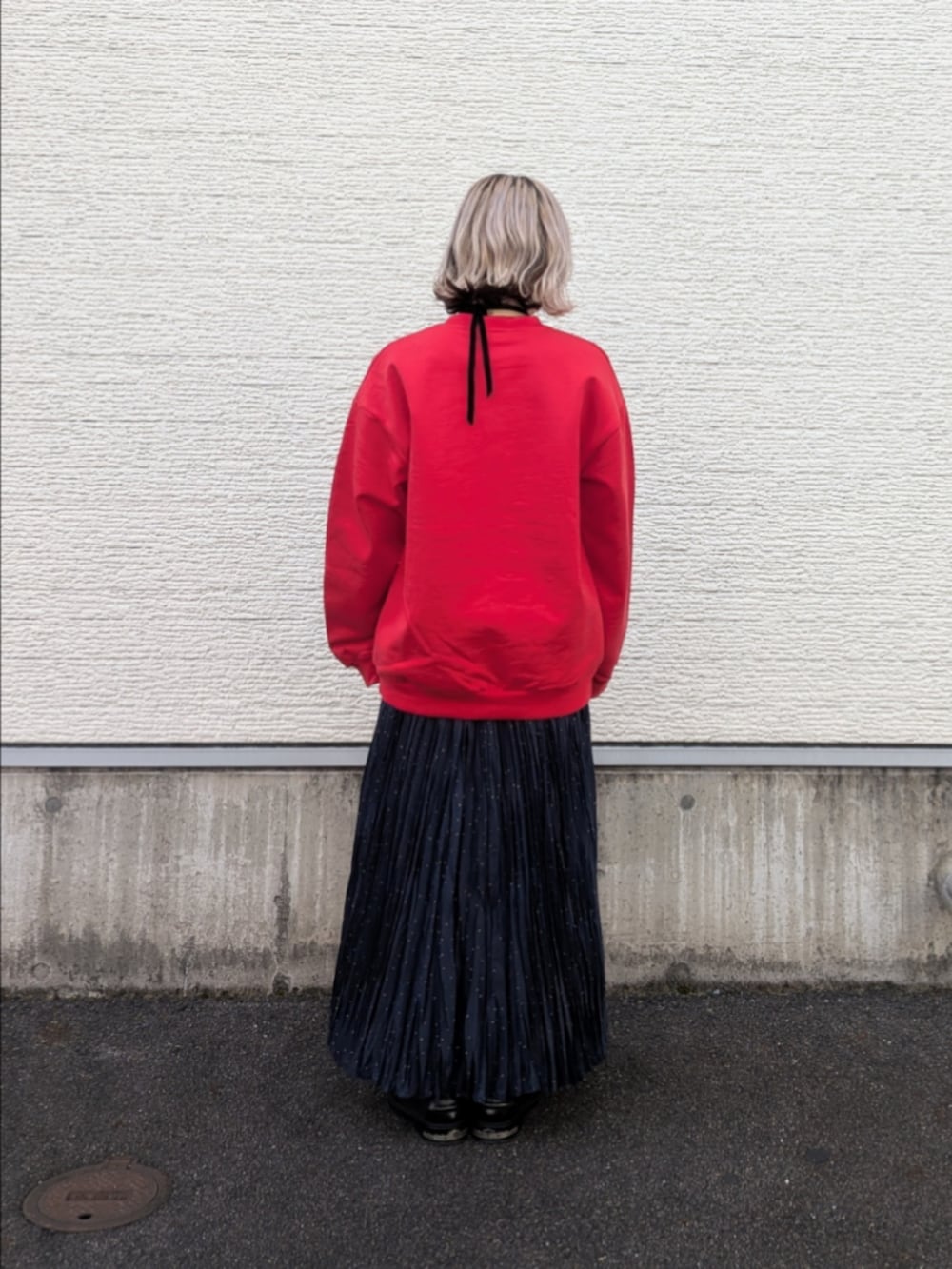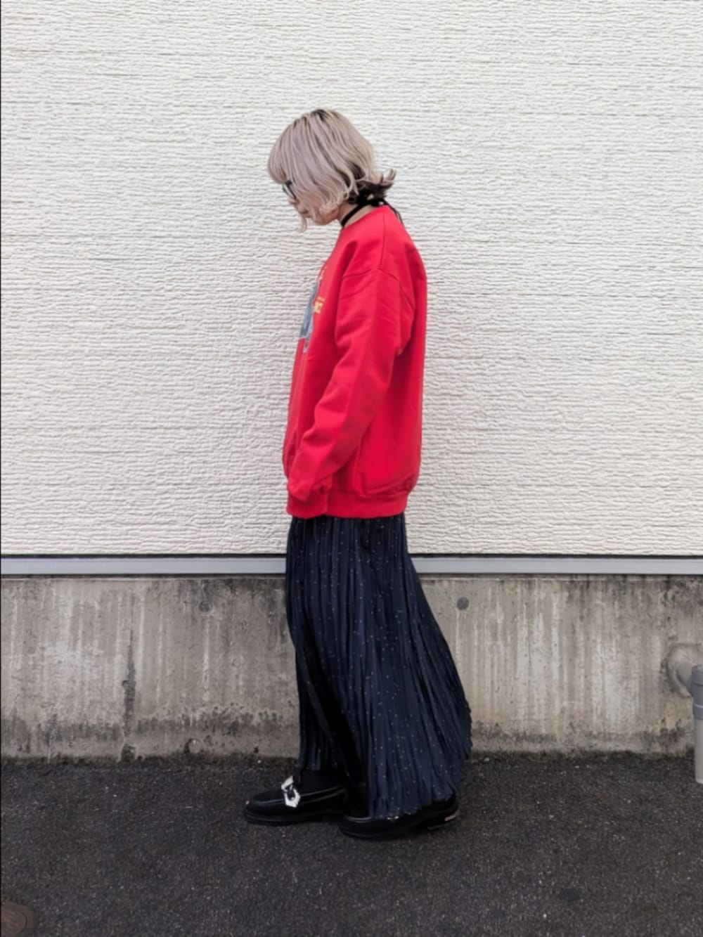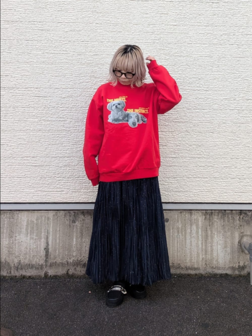 ラメドットの華やかなプリーツスカートをスウェットに合わせて敢えてカジュアルな装いにしてみました。
