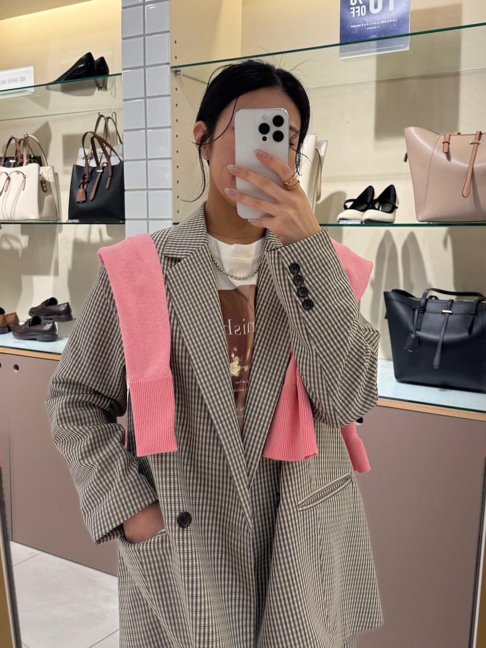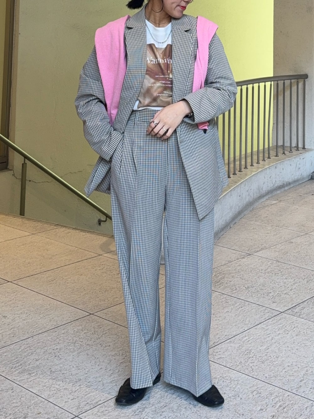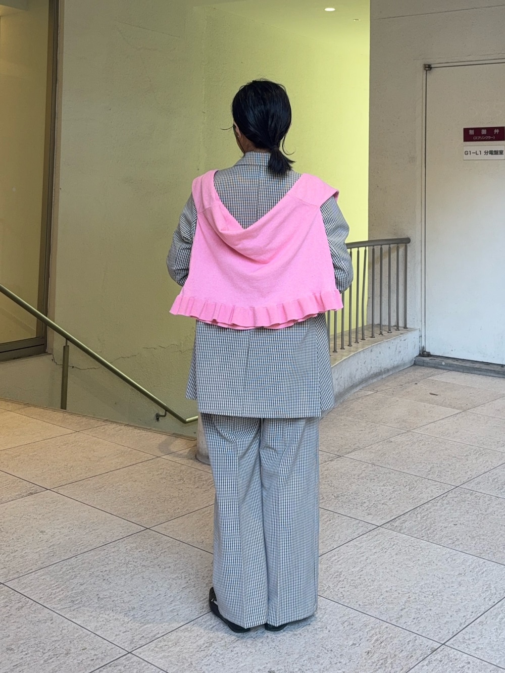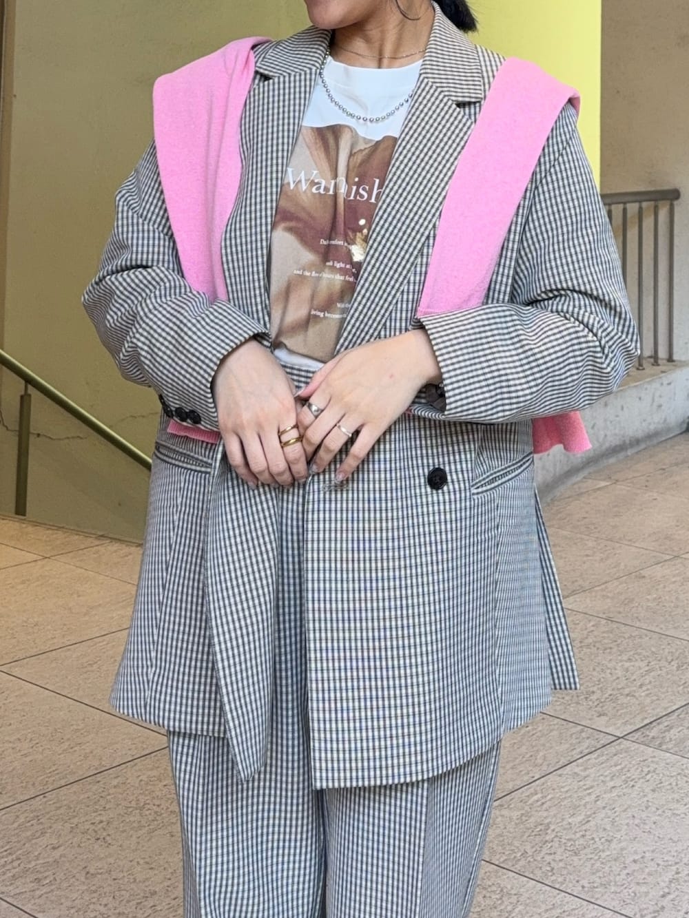 ピンクのカーディガンを肩掛けして