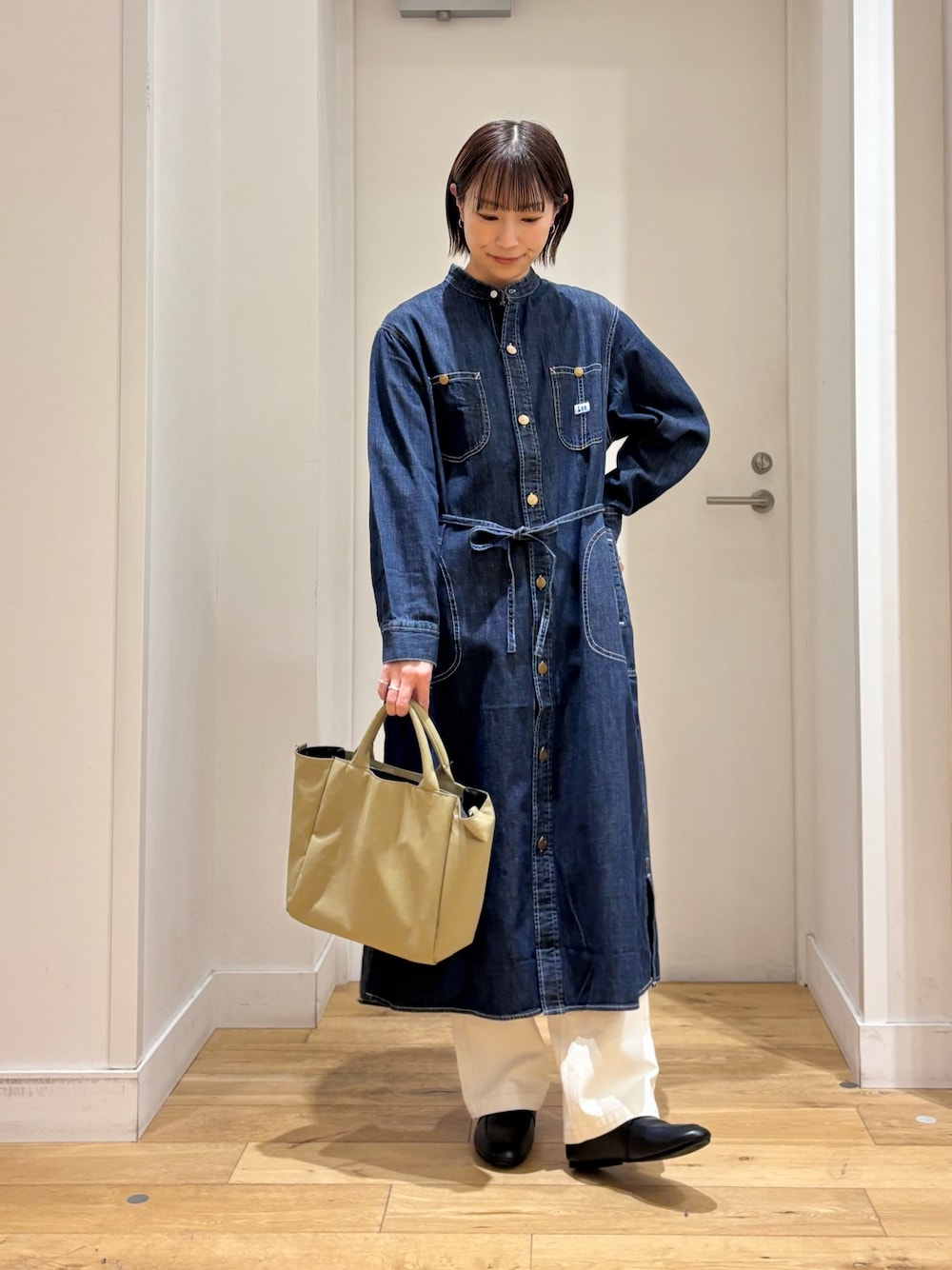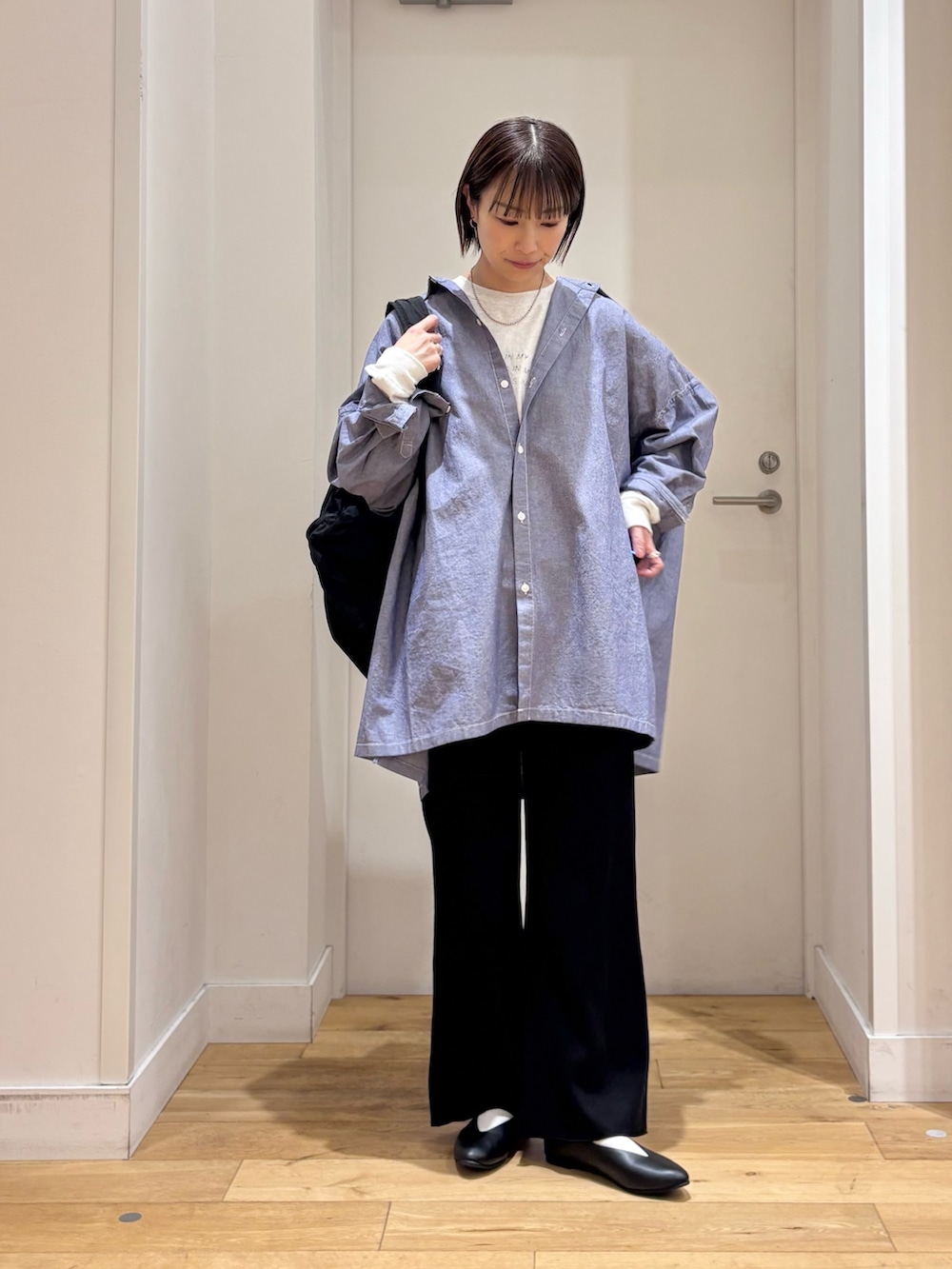 オーバーサイズが可愛いシャツは、軽い着心地の爽やかなシャンブレー生地で一気に春らしい印象に◎