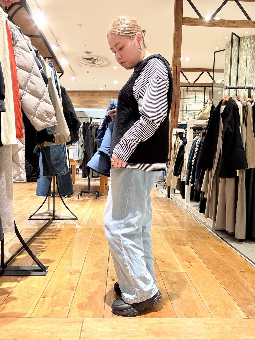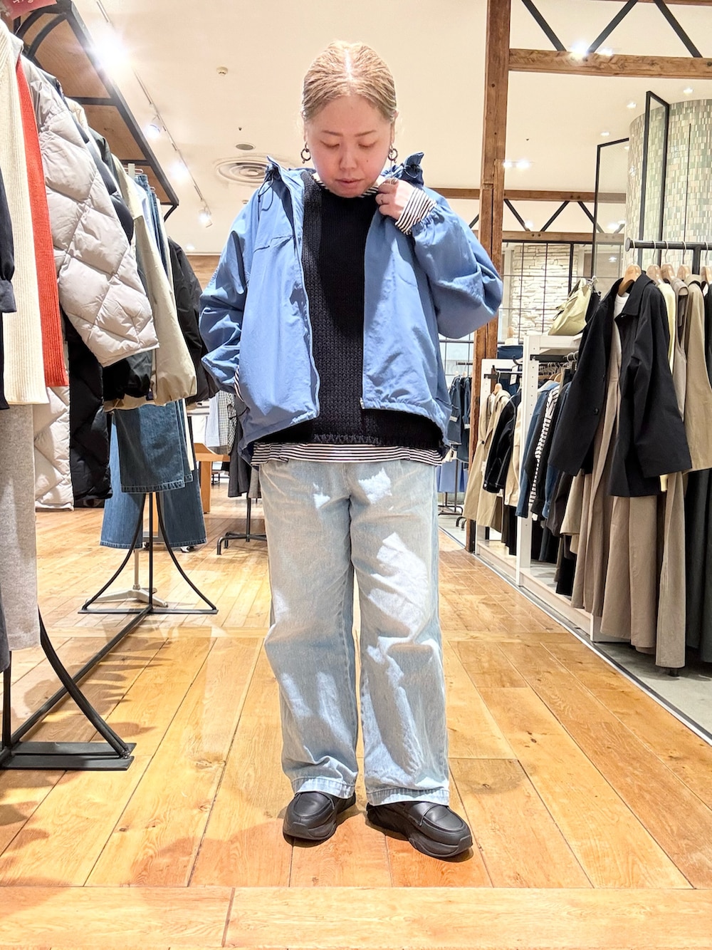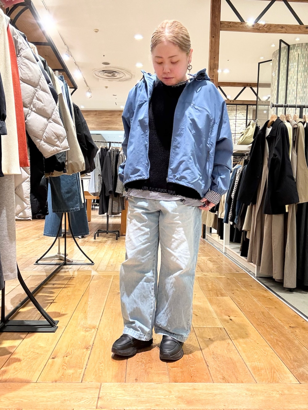 アウターで明るめのカラーをプラスしました➕