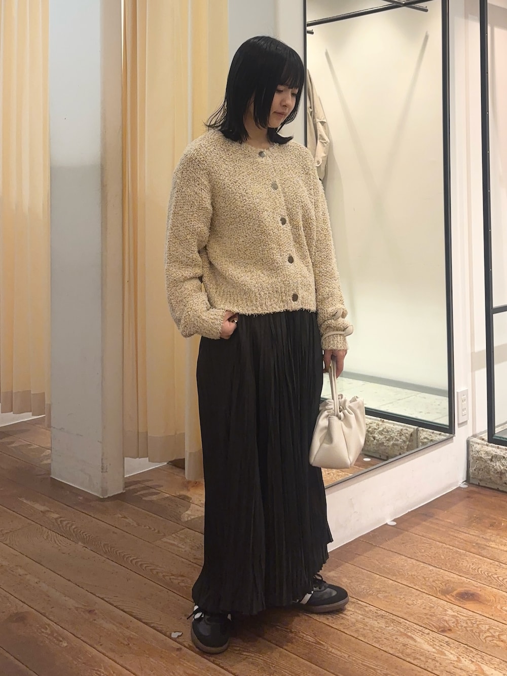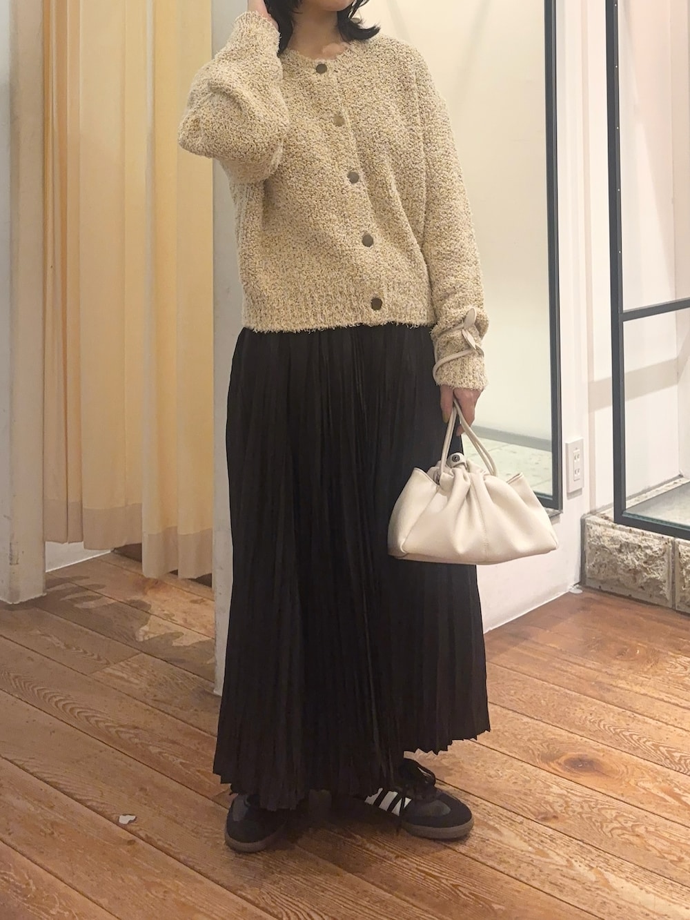 ランダムなプリーツデザインで、ボリューム感も抑えめなので、甘すぎずカジュアルにも着こなせます☘️