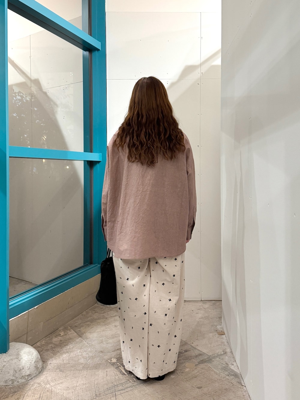 ピンクのシャツで柔らかさを出しつつ、ツバメ刺繍のパンツがさりげない遊び心をプラス🕊️