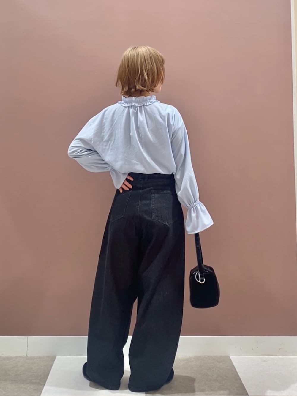 薄いブルーとフリルが可愛いブラウス×デニムの綺麗めカジュアルコーデ🐩🤍