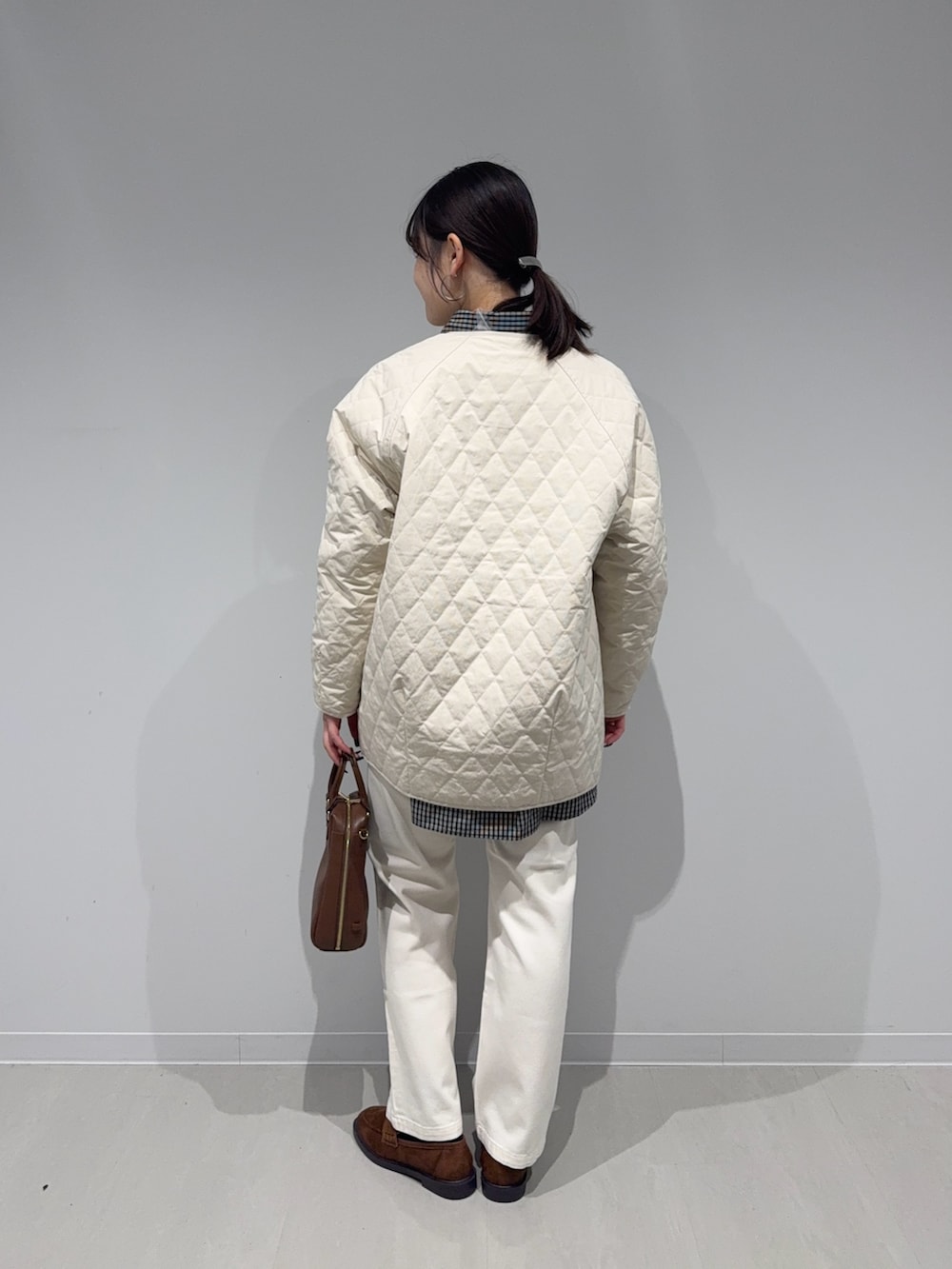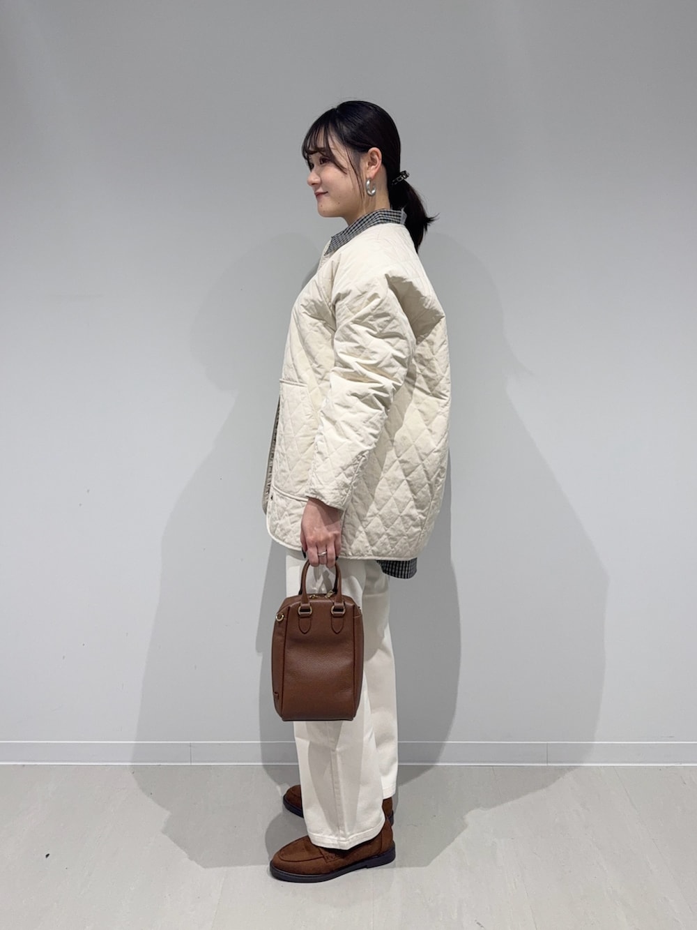 ノーカラーなのでシャツ合わせでチェック柄をアクセントに!小物はブラウンで統一感を出しました!