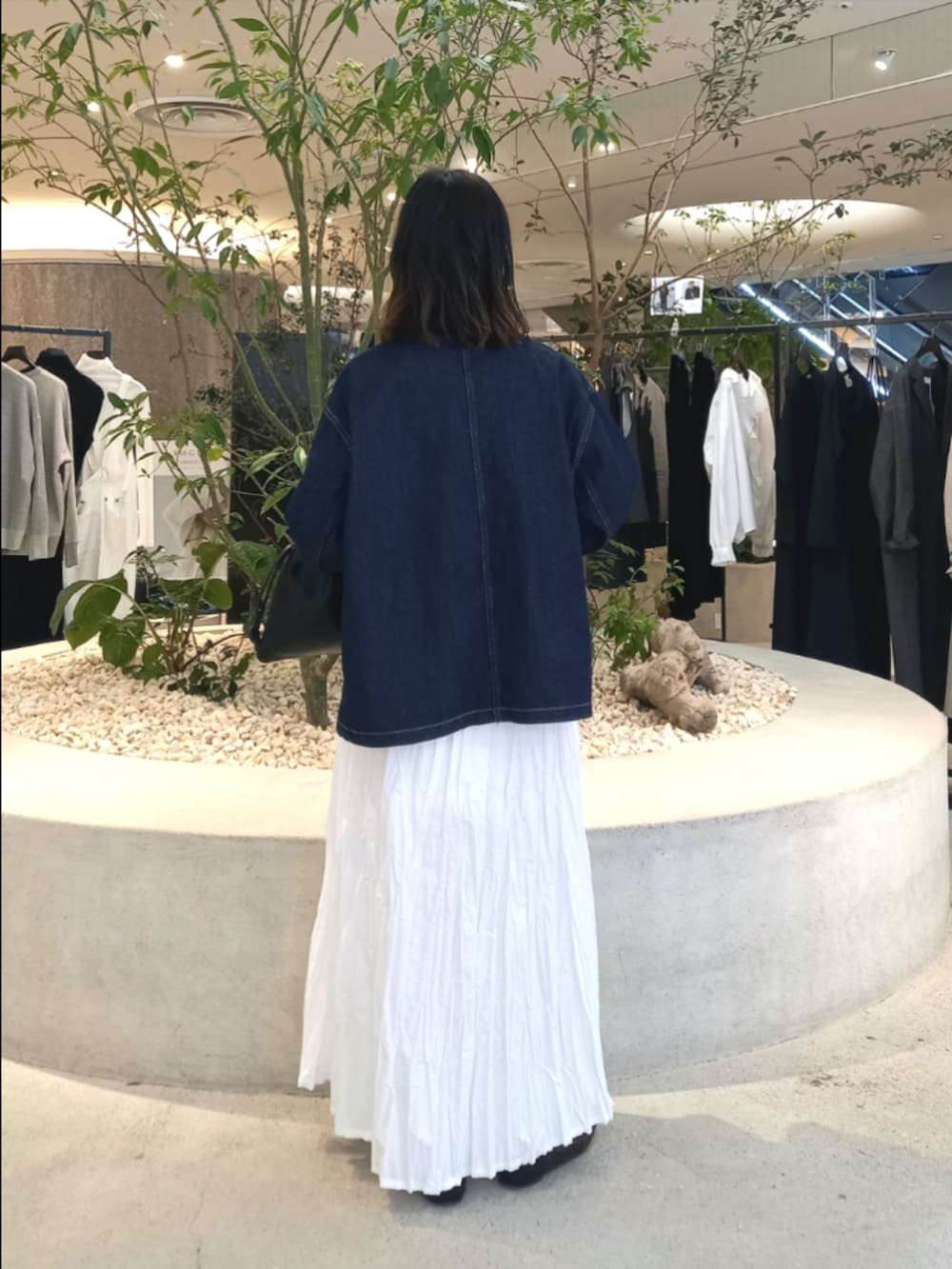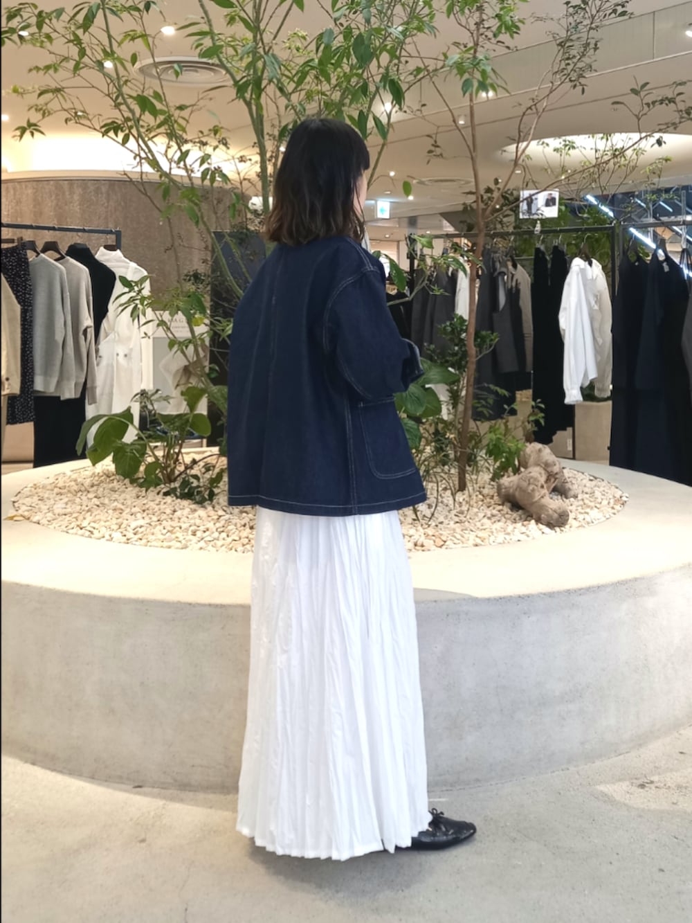 かぐれで定番人気のデニムカバーオールに、白のクリンクルスカートを合わせてみました。