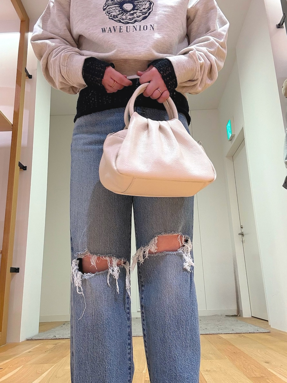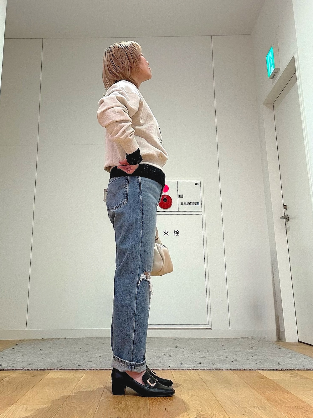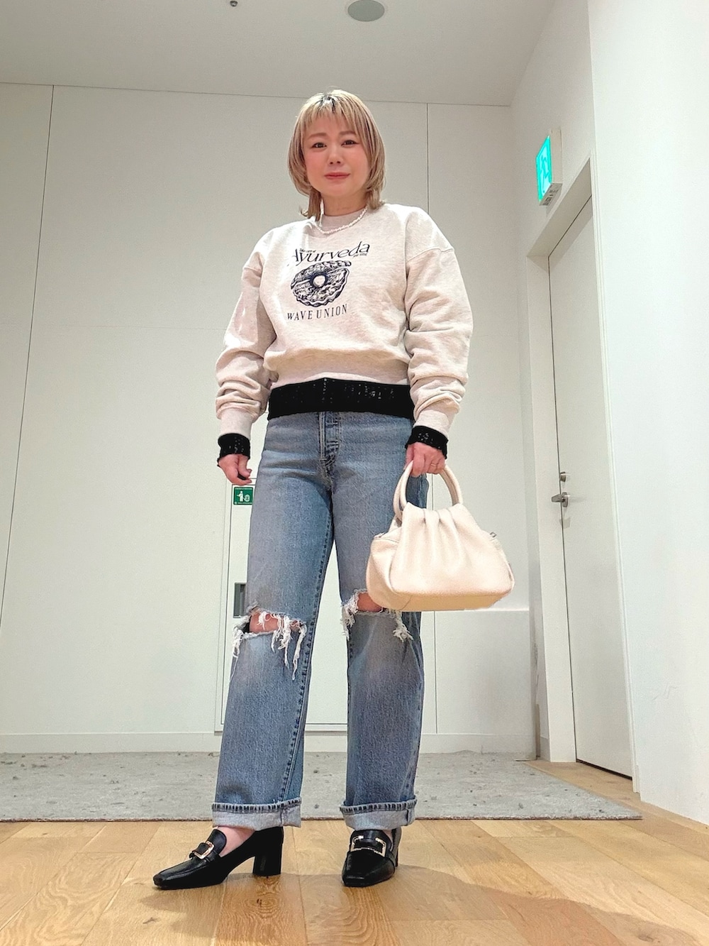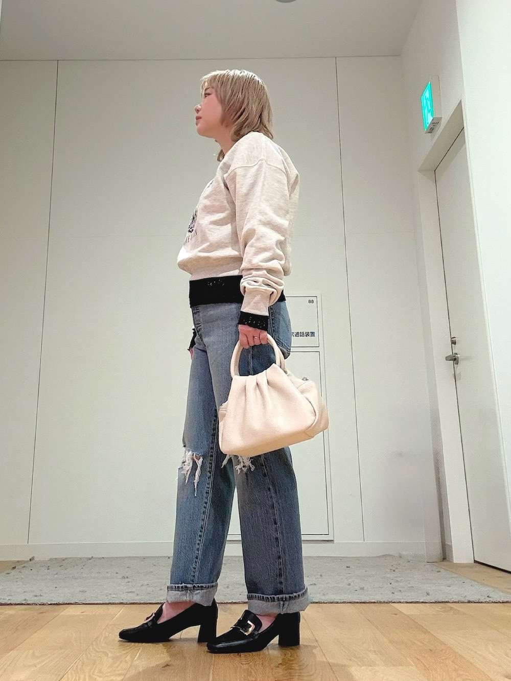 ダメージデニム合わせでも、ローファーと淡色バッグできれいめ要素をプラスしました。