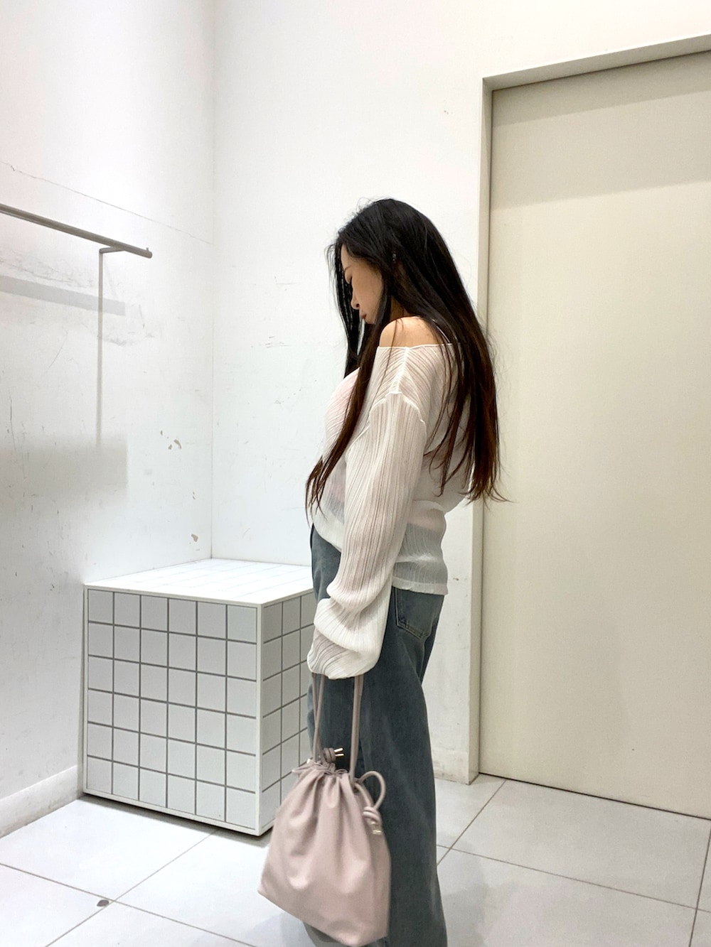 白とピンクで統一感を出しつつも、主張しないようにピンクを抑え、シアーのトップスで色気をプラス。