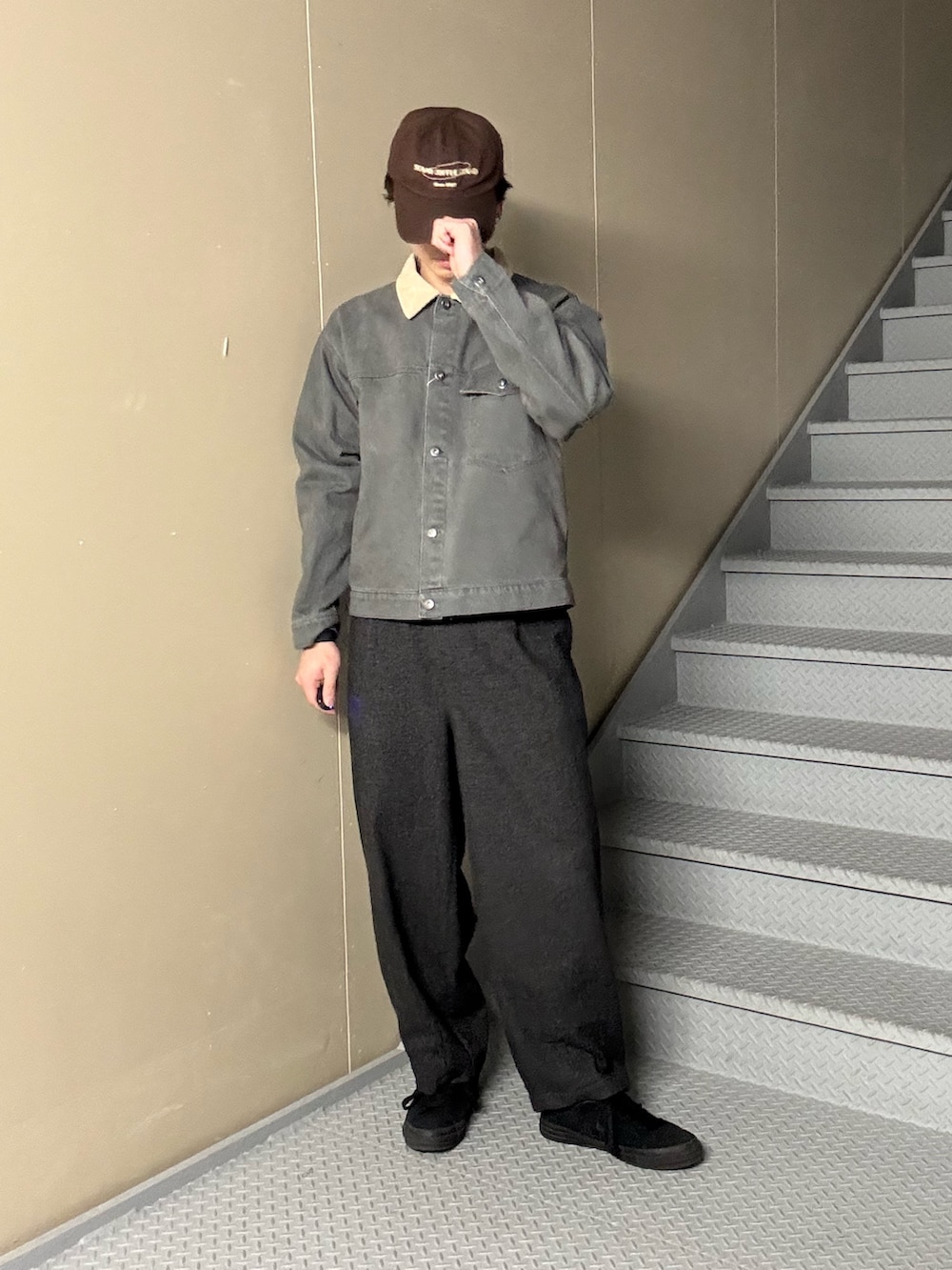 襟の切り替えがアクセントになるライトアウター。全体はダークトーンでまとめて、大人っぽさ重視。派手さはないけど、ディテールで見せるスタイル。