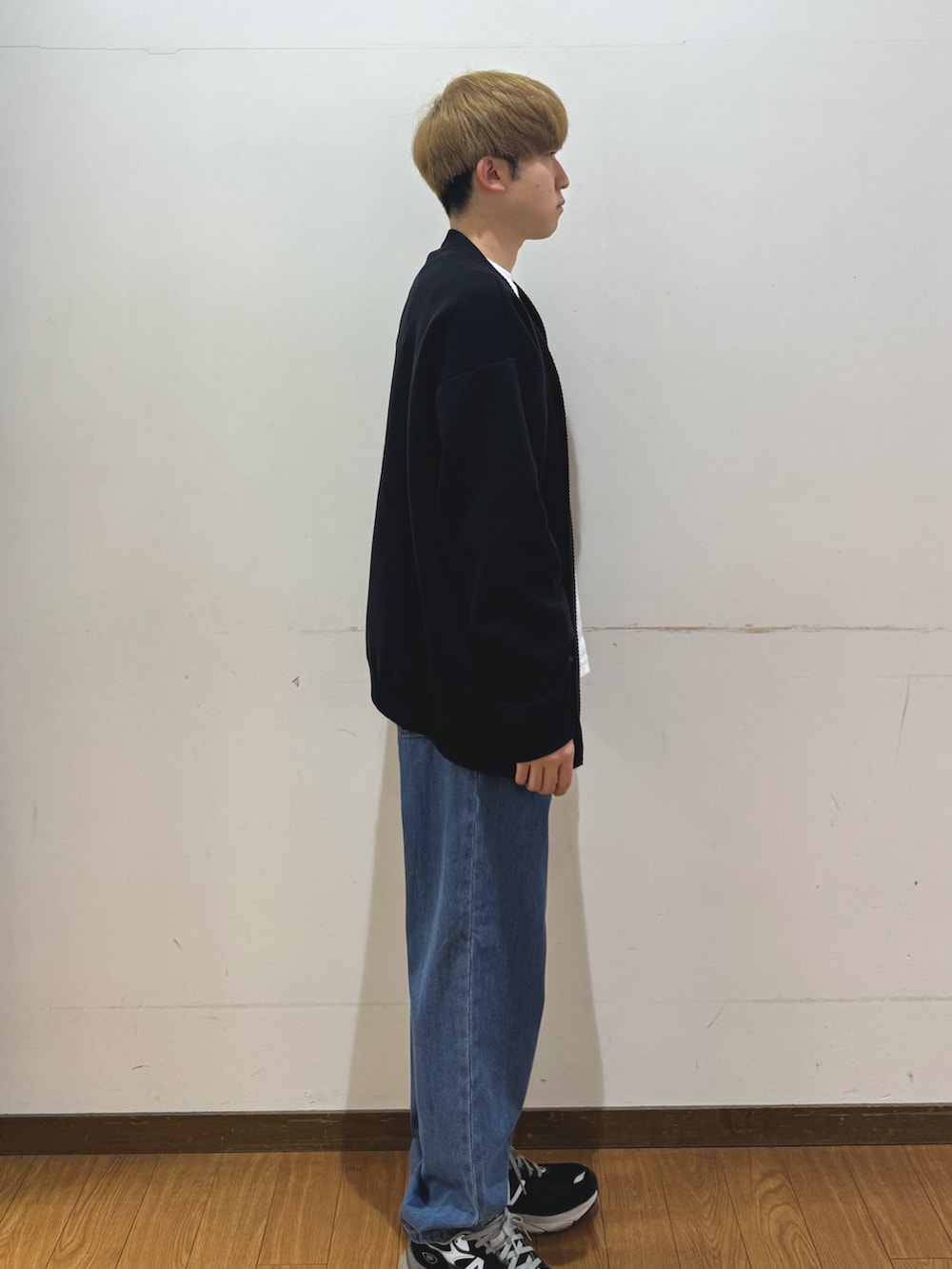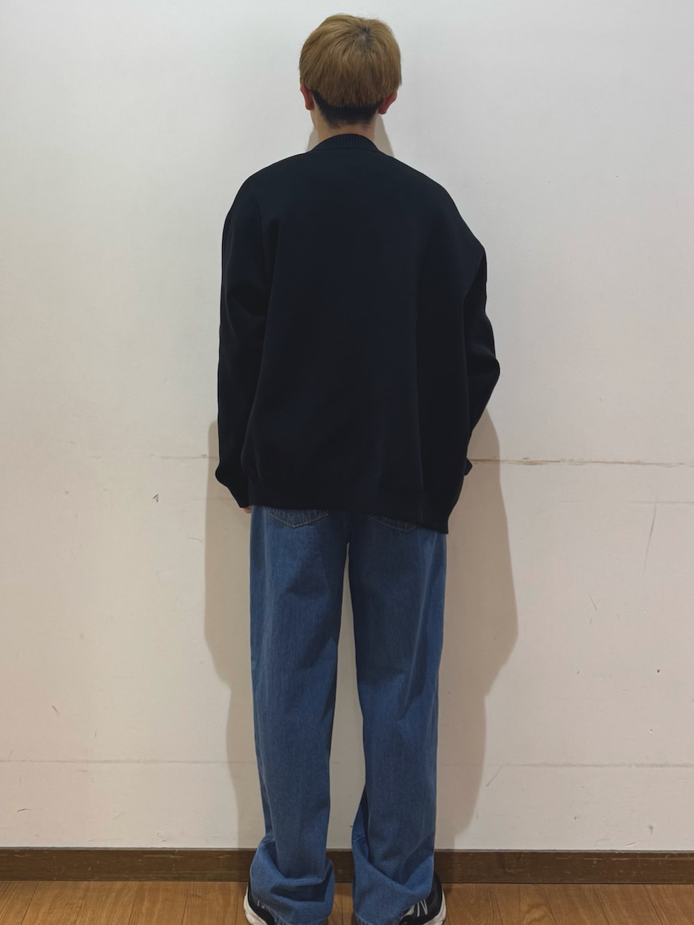 デニムパンツは足回りが少しスッキリめで、キレイなシルエットに仕上げやすいです。今回はカジュアルコーディネートしたかったので、足元はかなりゆとりあるようにしました