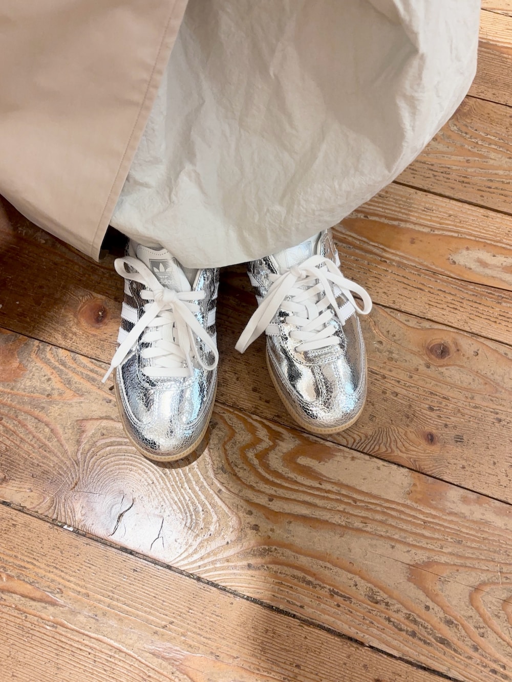 シルバーの色味が可愛くて、春のスタイリングに重宝するアイテムだと思います!今回のように淡い色味の中の差し色にもなりますし、オールブラックコーデに合わせるのもおすすめです