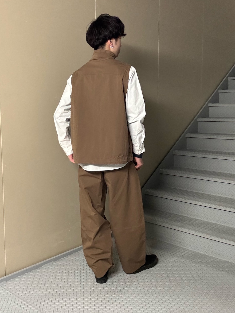 ブラウンのベストとワイドパンツで統一したワントーン構成。インナーの白シャツで抜け感をつくり、重たさを回避。ゆったりしたシルエットで余裕のある印象。色数を絞った中で、素材の軽さと立体感で見せるスタイル。