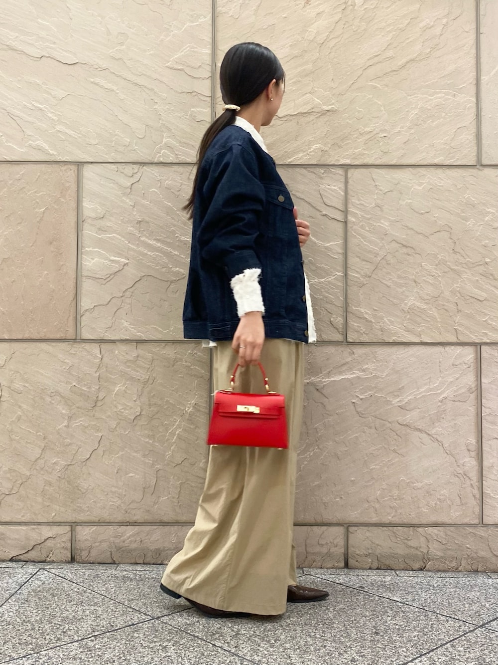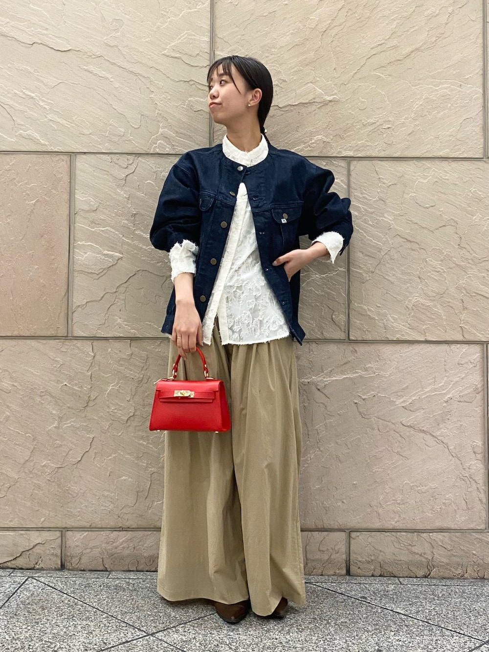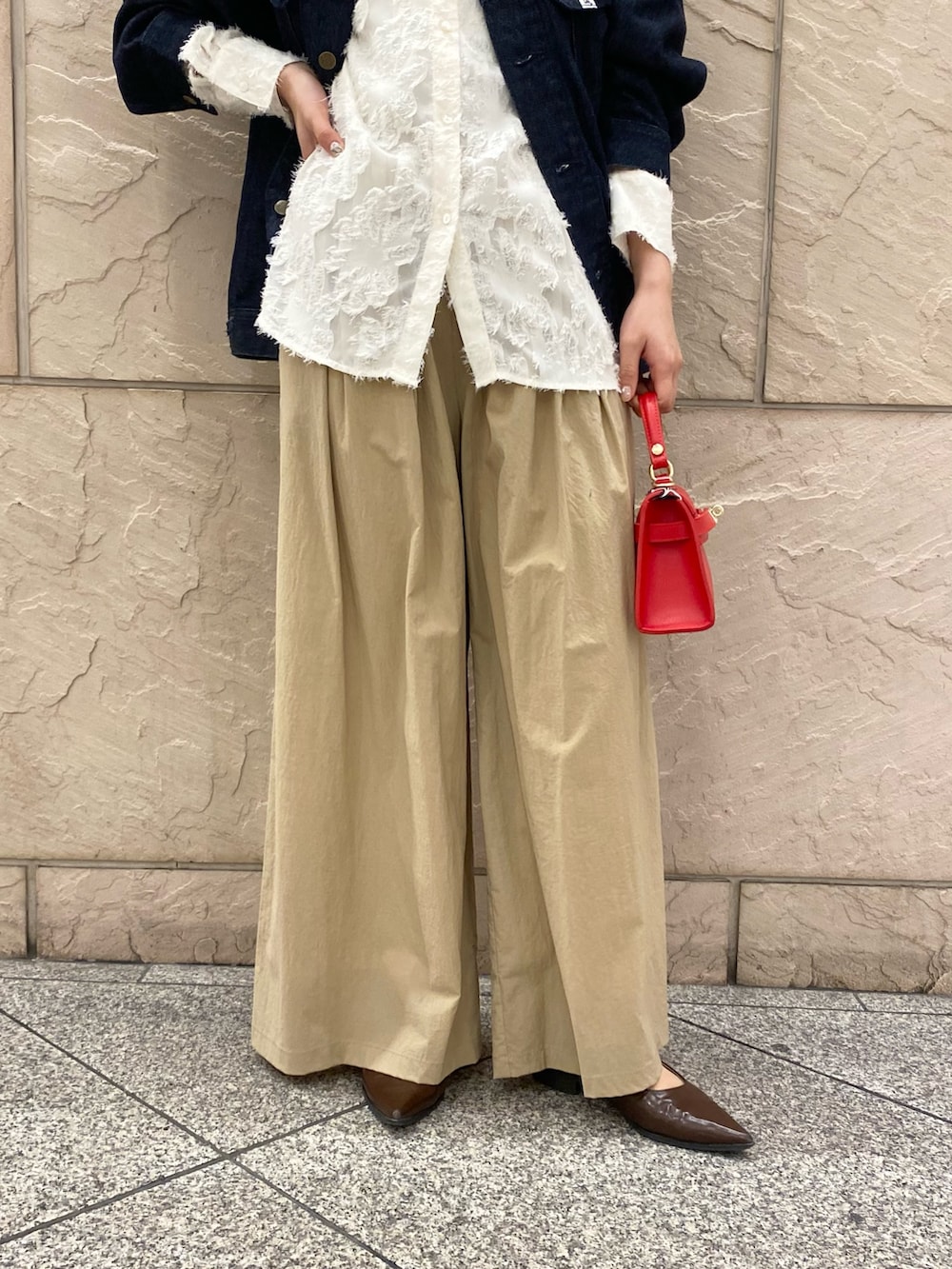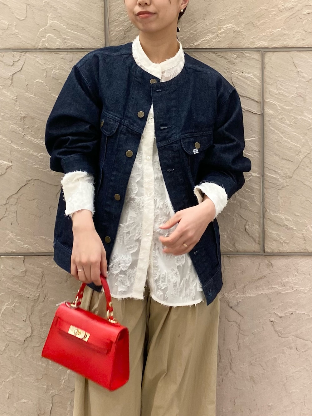 デニムジャケットの裾から出てくる白がかわいい!