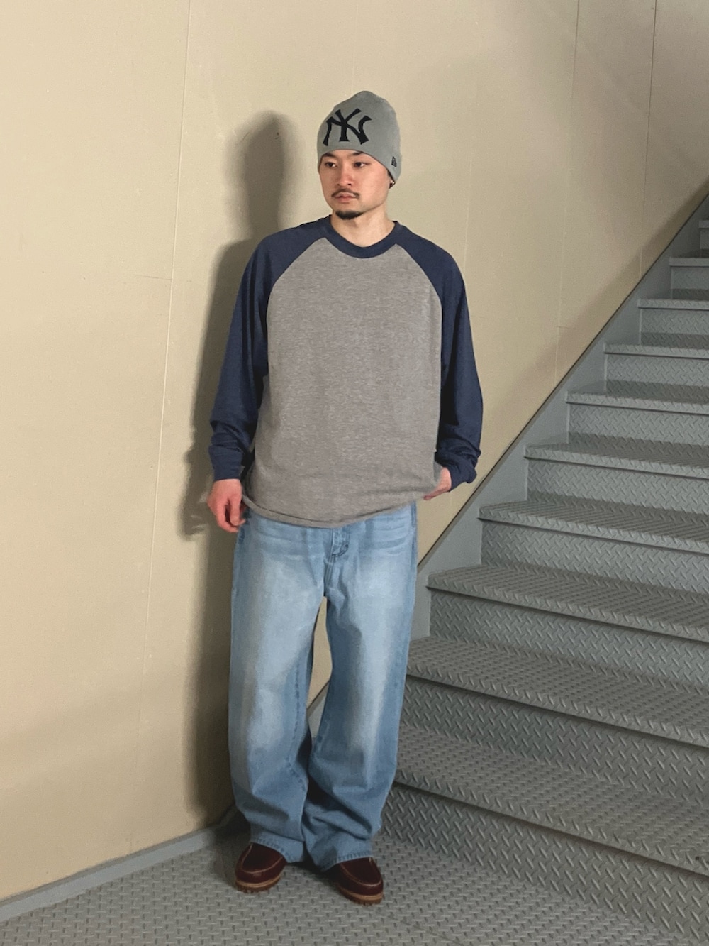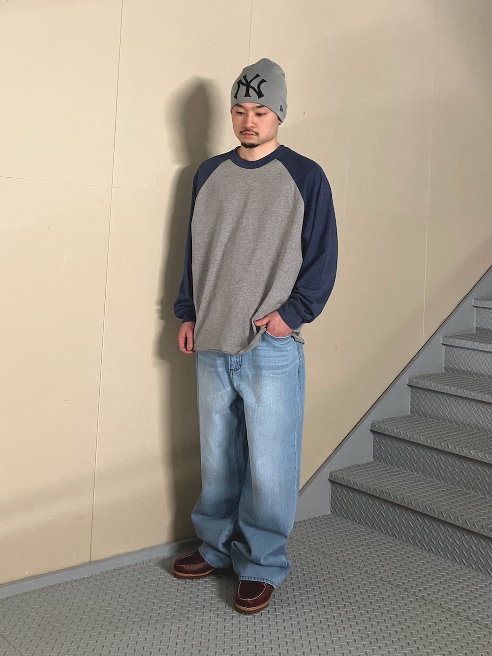 ヴィンテージライクなFORK&SPOONのベースボールシャツ良いですね。パンツもサイズを上げて全体的にゆったりとしたサイズ感を意識しました。足元はTimberlandの3eye classicでストリート色を少々強めにしています。