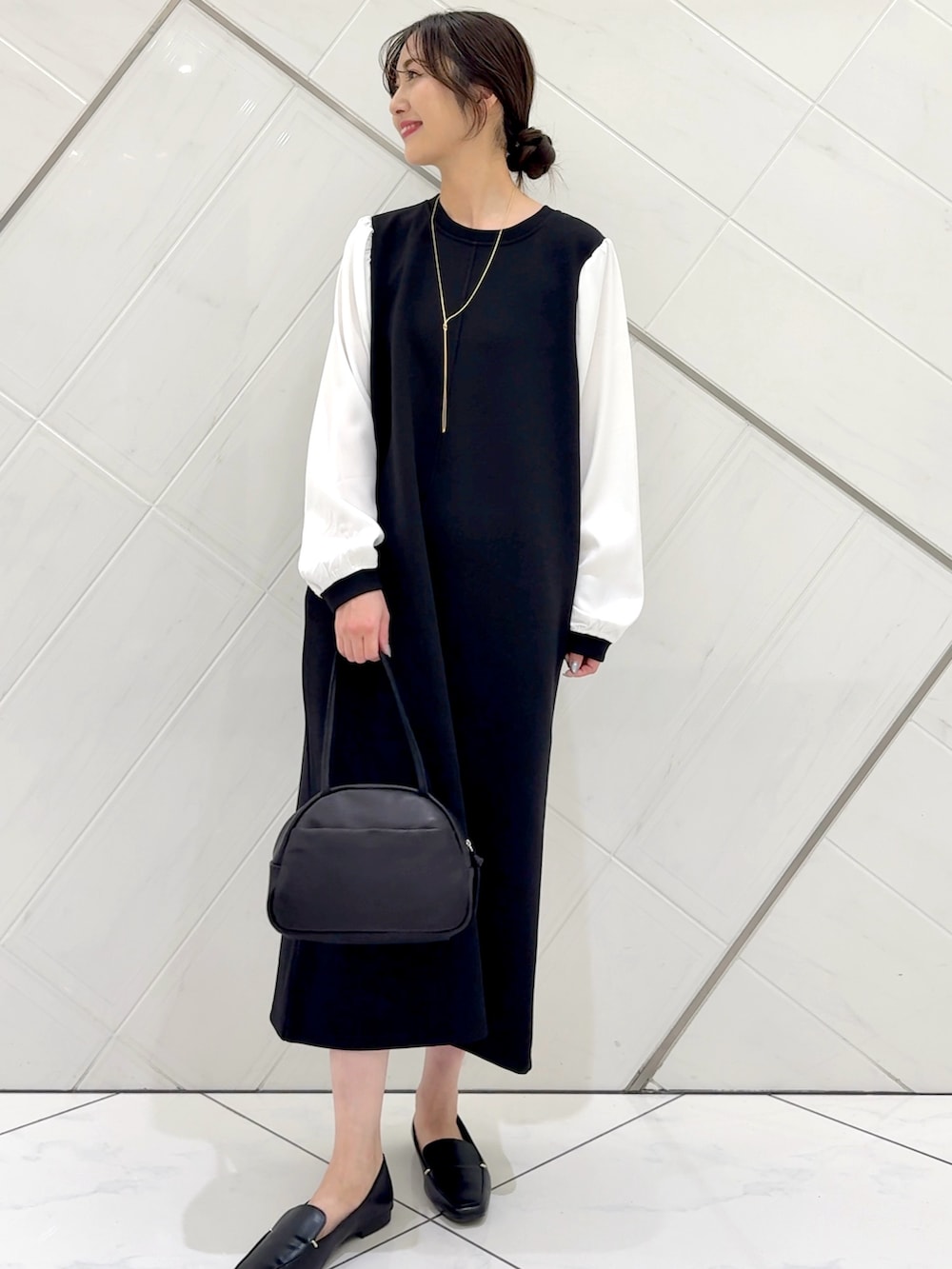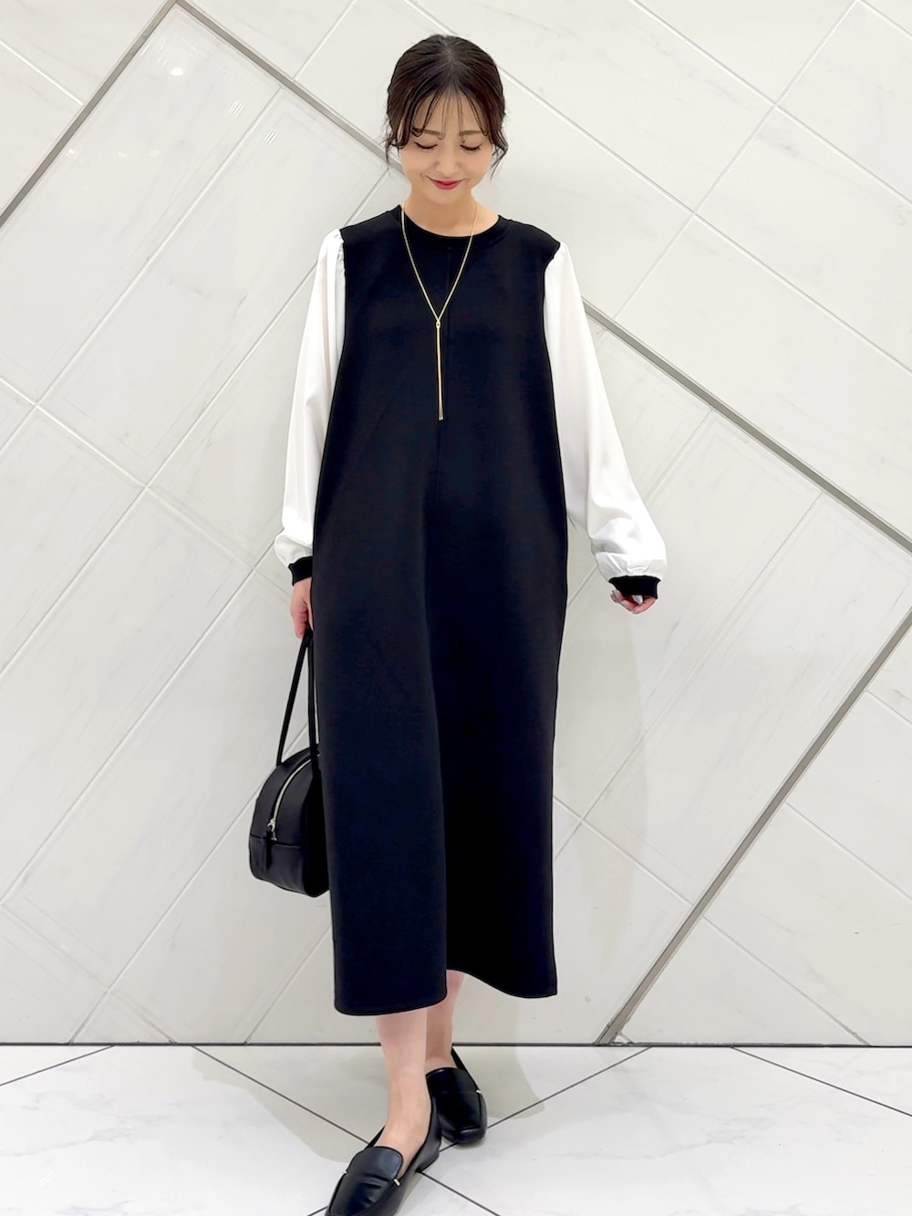 胸元はシンプルなのでロングネックレスを付けるとアクセントになるのでおすすめです。