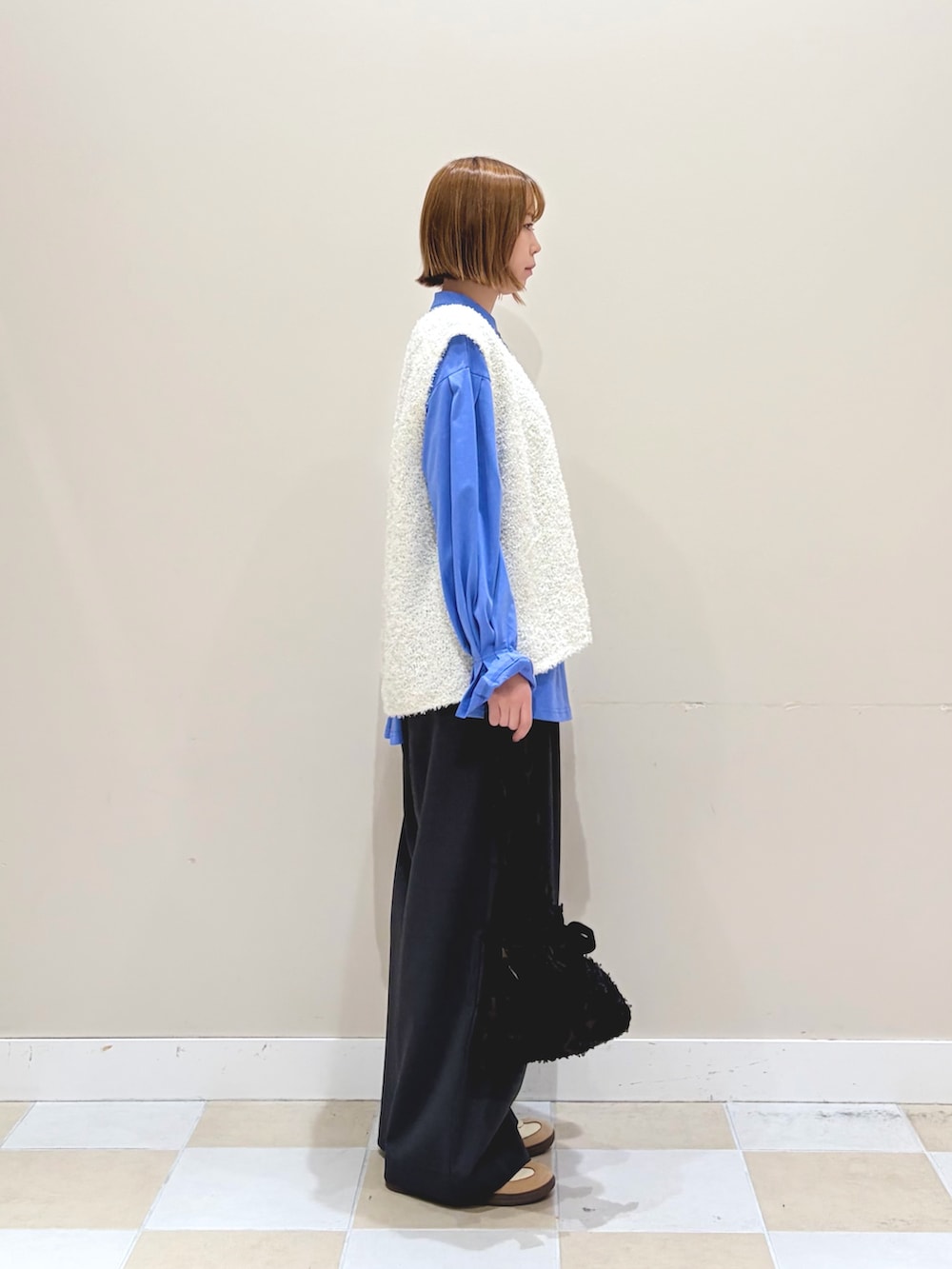 リボンヤーンのゆるっとしたニットベストにバンドカラーシャツ風カットソー、イージーパンツでカジュアルな春スタイルに。