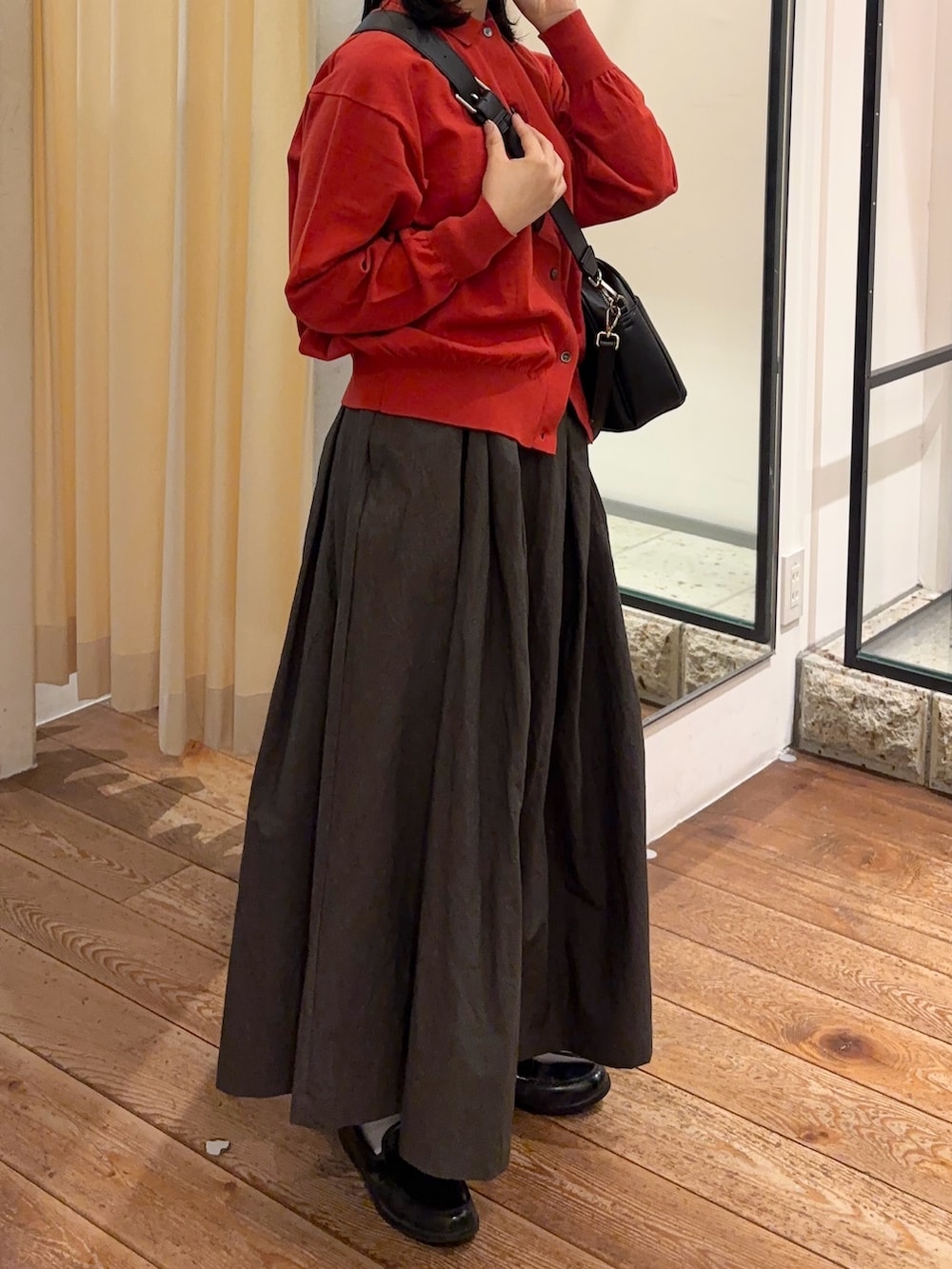 タックから生まれるボリュームが程よい甘さを表現してくれます!生地がしっかりとしているので長いシーン着用可能です🙆🏻遠州染めならではの風合いが存在感たっぷりです✨強風と日光を浴びた独特なムラや細かなしぼが特徴です◎