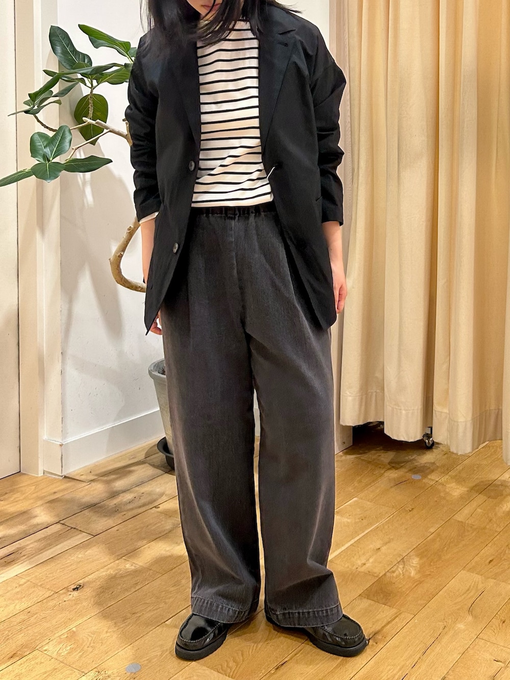 かっちりし過ぎないのでデニムとボーダーでカジュアルにも合わせやすいです!