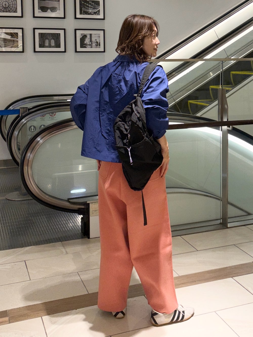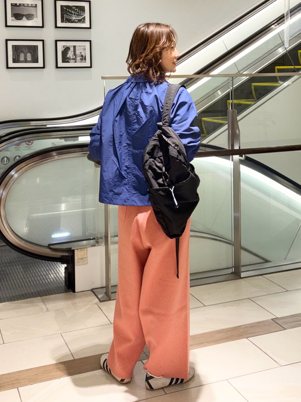 かぐれのシャーベットのようなピンクパンツは、かなり太めのシルエットです。ゆるさがリラックス感を強めますが、綺麗色なので女性らしく着られます。