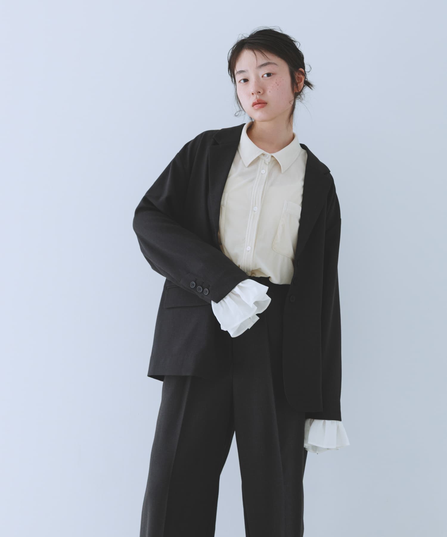 合わせたジャケットは袖口のフリルがポイント!
