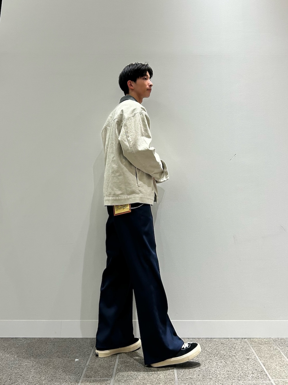 パンツは別注ラングラーのスラックスで
