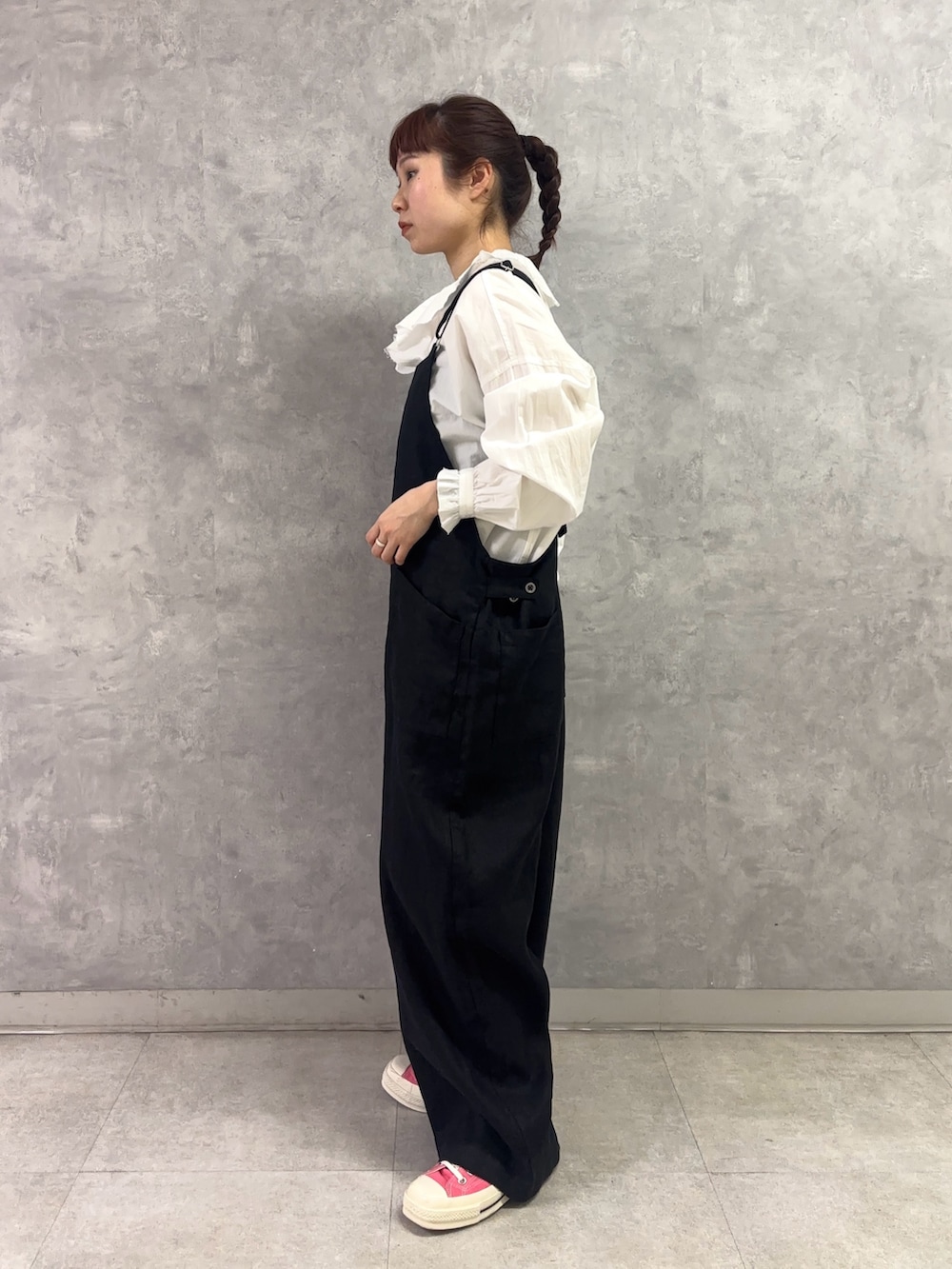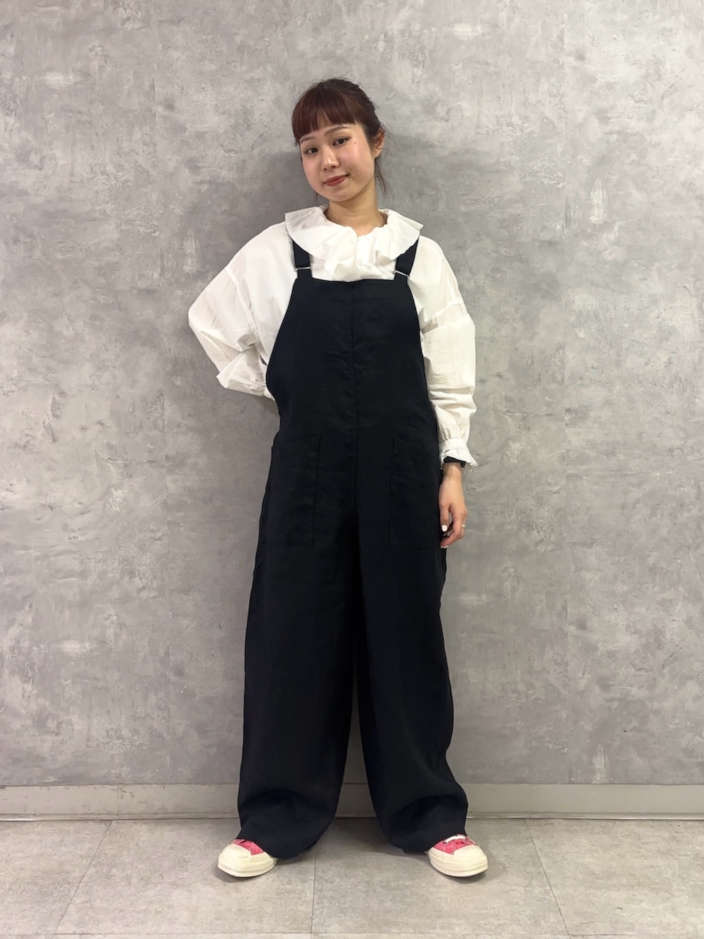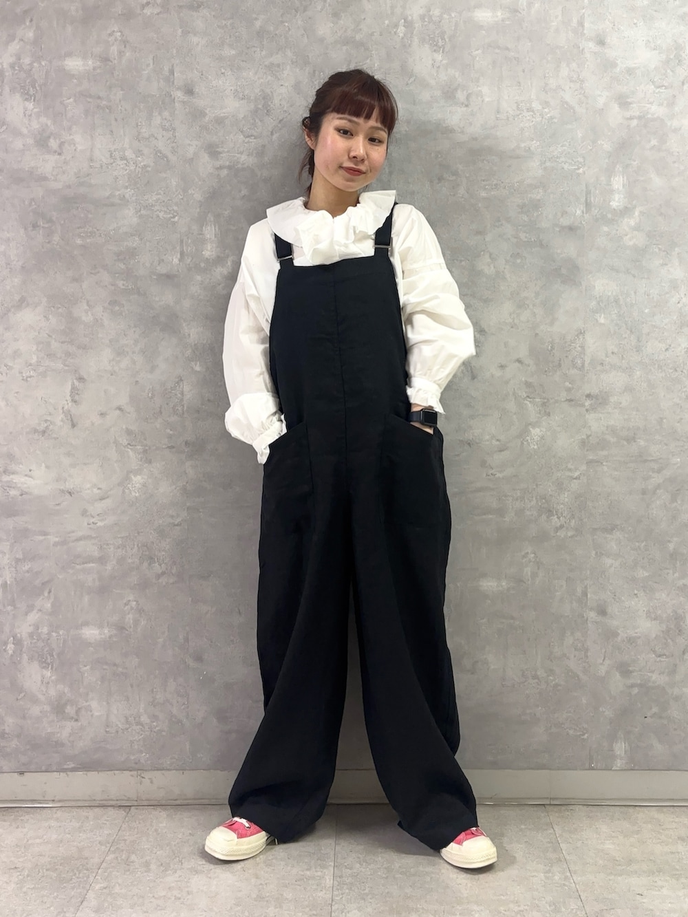 胸元のフリルがなんとも可愛く、それでいて黒のサロペットに重ねるとどこかカッコ良くも見えるこの合わせ、堪りません。