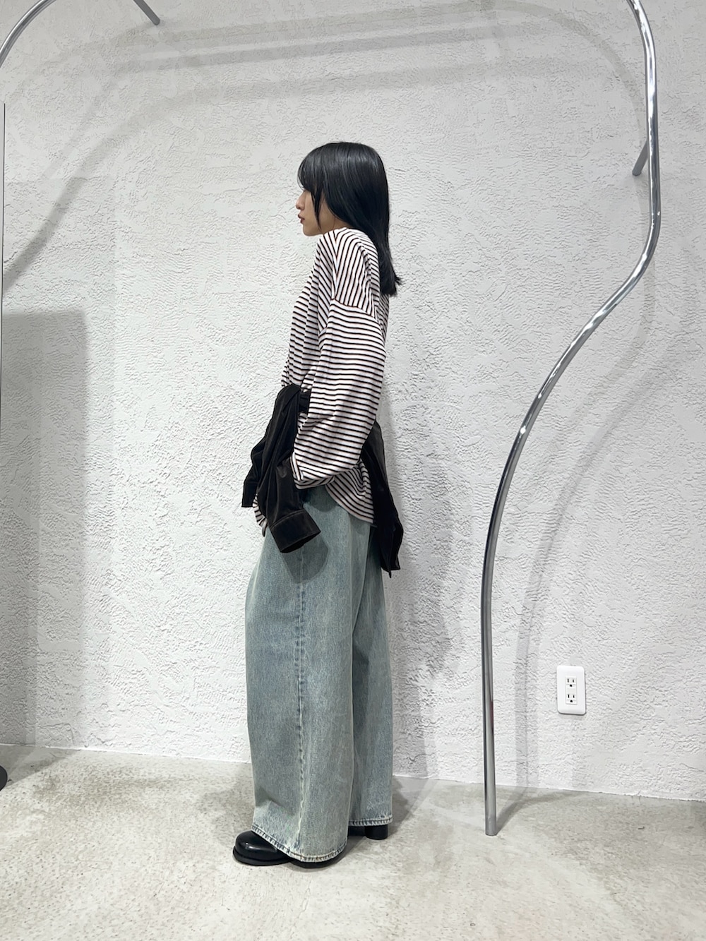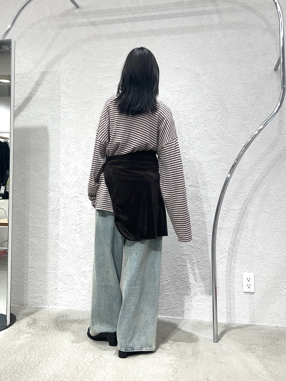 ボーダーニットにデニム、ベロアシャツを合わせて着てみました。