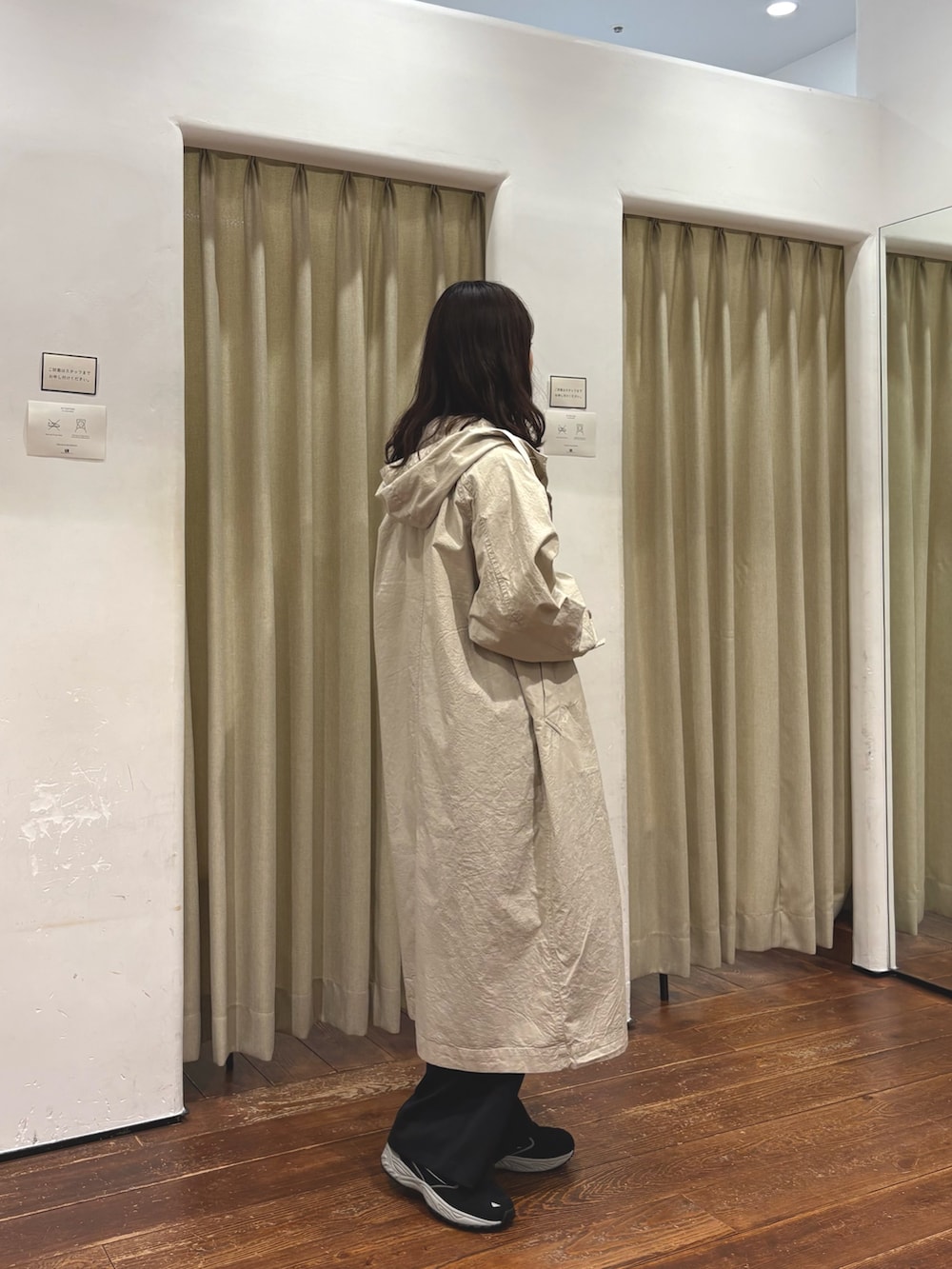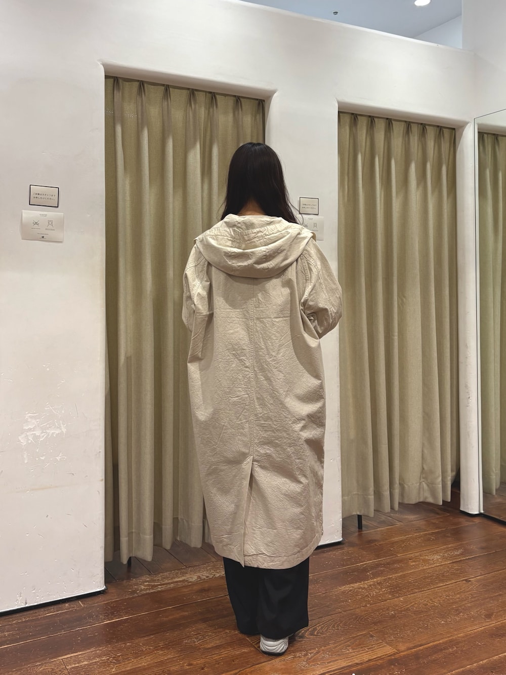 しっかり丈の長さがあり、落ち感もある為、身幅はワイドながらもすっきり見えするアウターです。フードも可愛いポイントです。